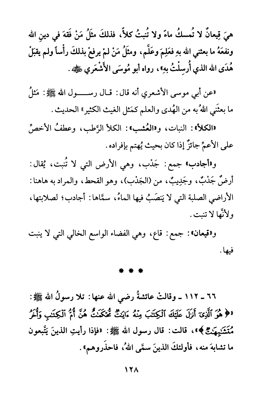 66 – 112 – وقالت عائشة رضي الله عنها: تلا رسول الله صلى الله عليه وسلم: " {هو الذي أنزل عليك الكتاب منه آيات محكمات هن أم الكتاب وأخر متشابهات} ",قالت: قال رسول الله صلى الله عليه وسلم:" فإذا رأيت الذين يتبعون ما تشابه منه , فأولئك الذين سمى الله , فاحذروهم ".