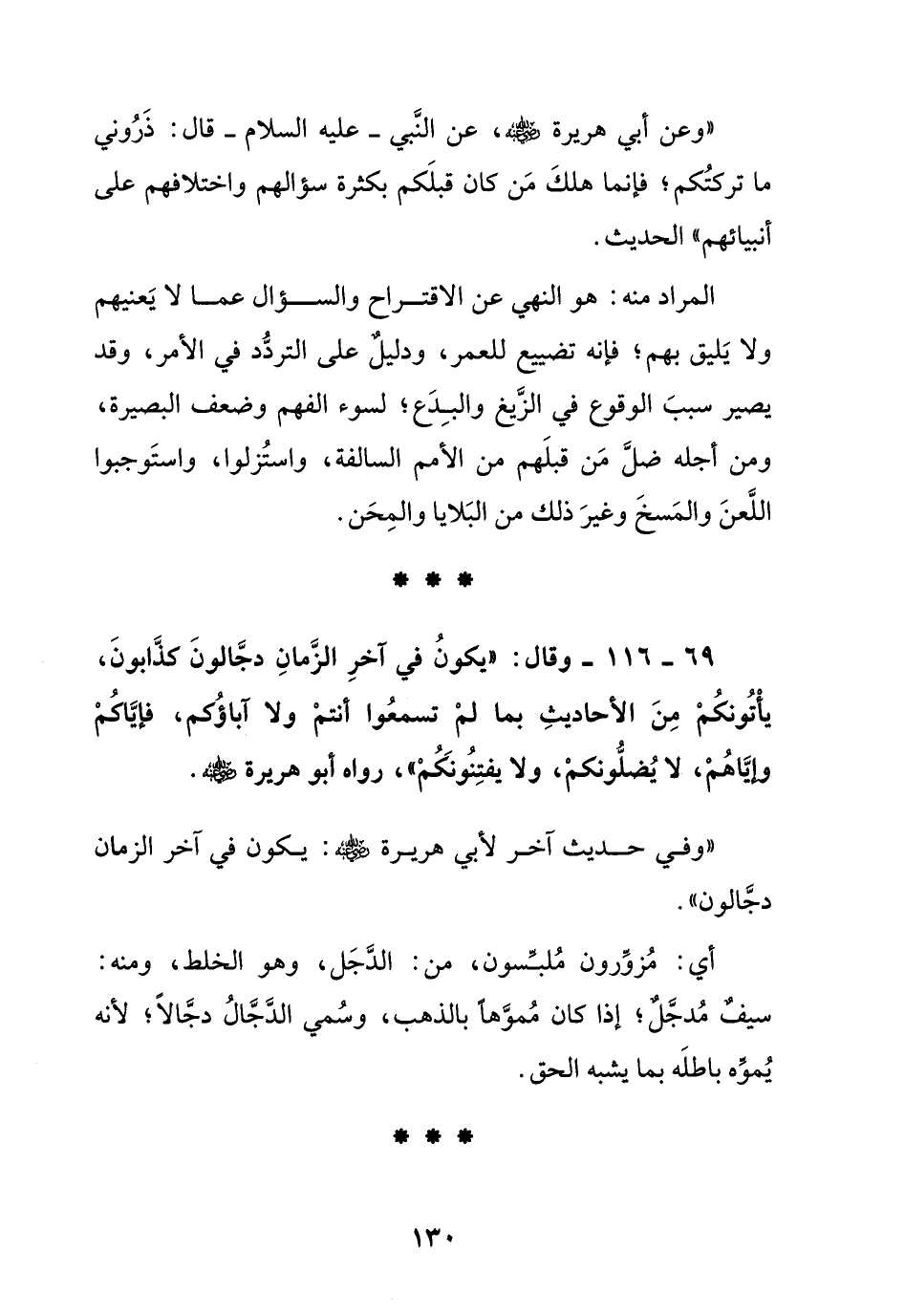 "وعن أبي هريرة رضي الله عنه عن النبي – عليه السلام – قال: ذروني ما تركتكم فإنما هلك من كان قبلكم بكثرة سؤالهم واختلافهم على أنبيائهم " الحديث.