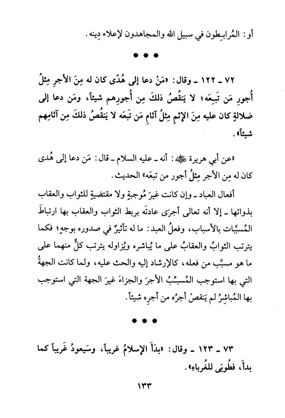 73 – 123 – وقال:" بدأ الإسلام غريبا , وسيعود غريبا كما بدأ فطوبى للغرباء ".
