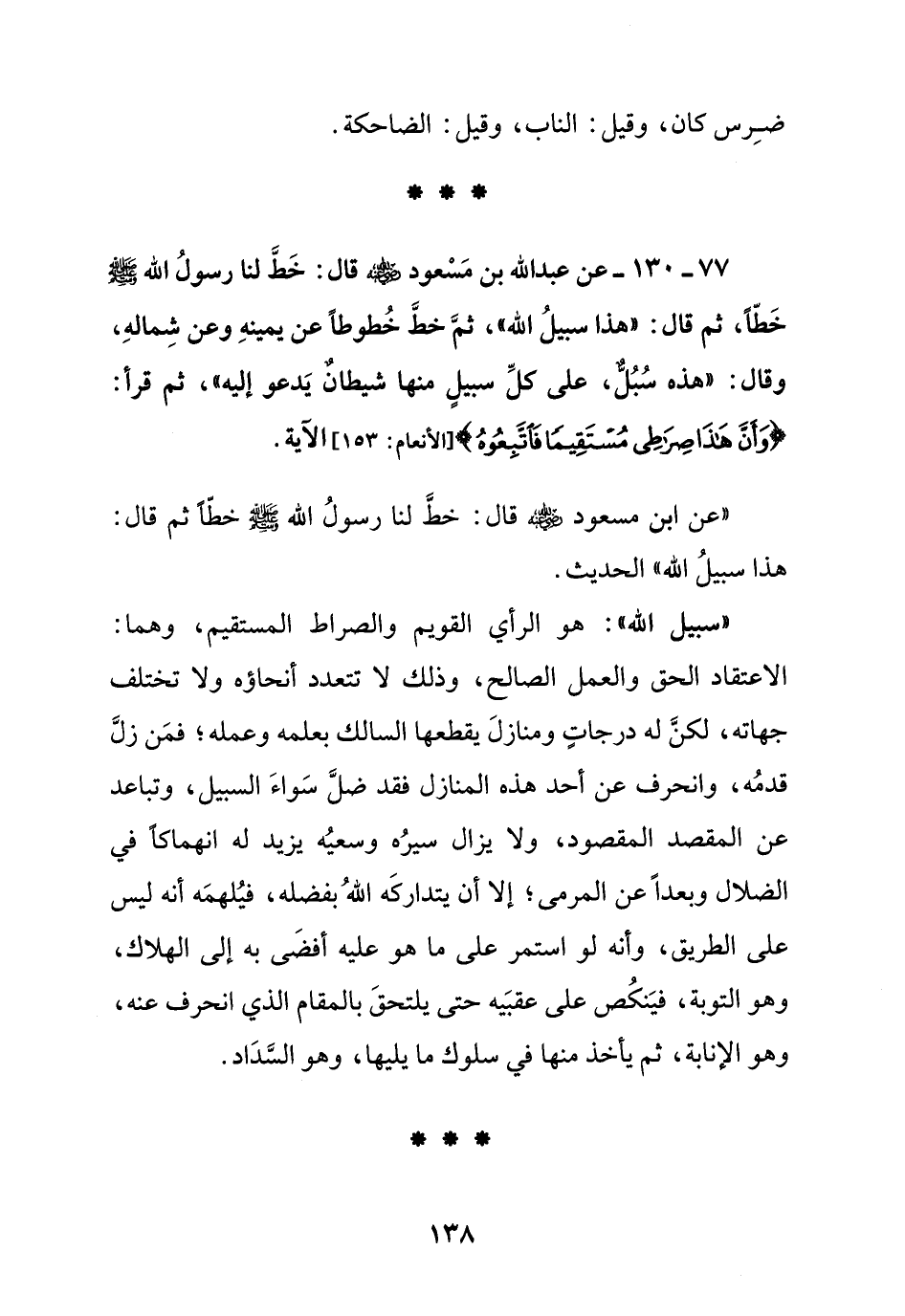 77 – 130 – عن عبد الله بن مسعود رضي الله عنه قال: خط لنا رسول الله صلى الله عليه وسلم خطا , ثم قال:" هذه سبيل الله " ثم خط خطوطا عن يمينه وعن شماله , وقال: "هذه سبل على كل سبيل منها شيطان يدعو إليه " ثم قرأ: {وأن هذا صراطي مستقيما فاتبعوه} [الأنعام:153] الآية.