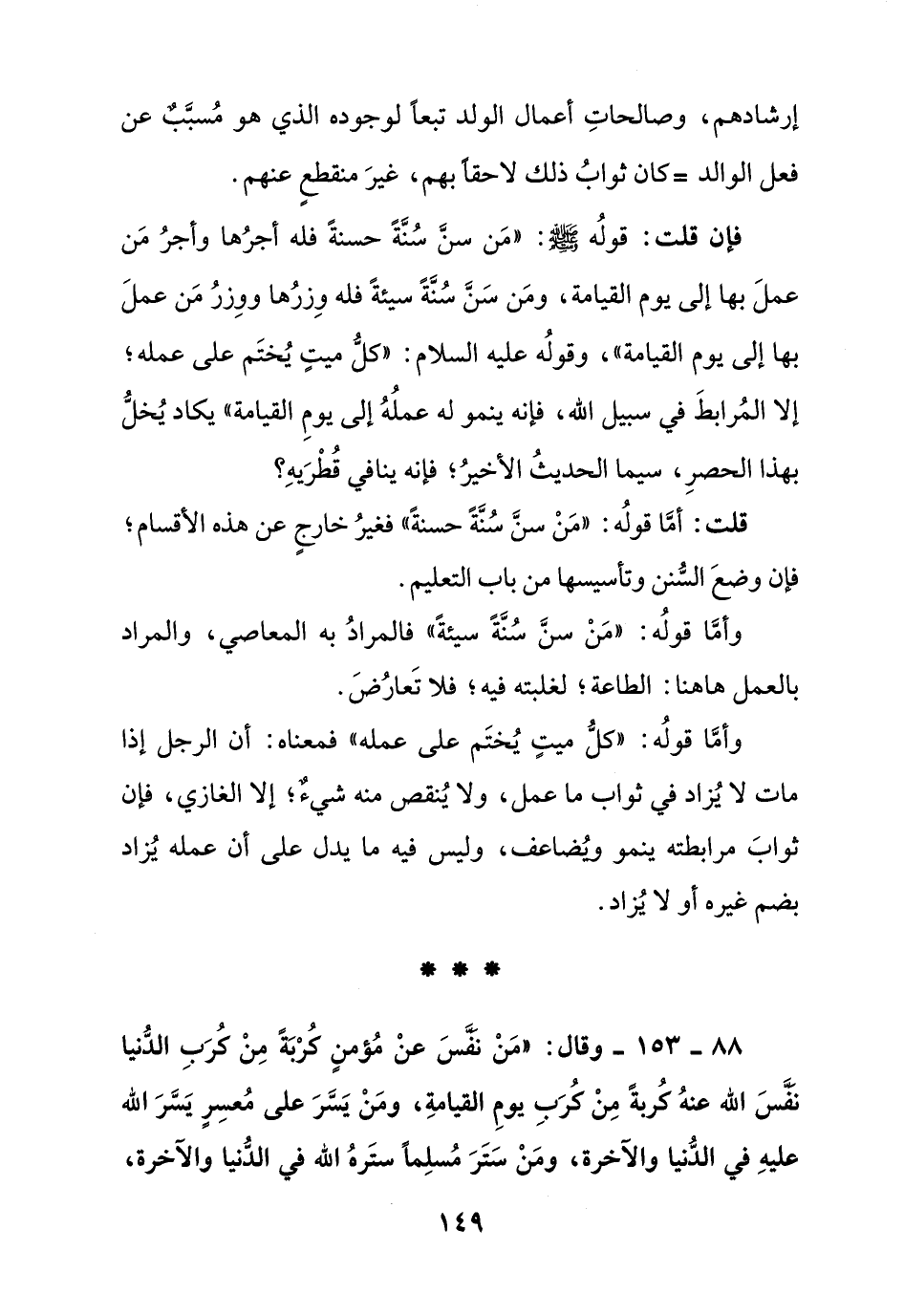 88 – 153 – وقال:" من نفس عن مؤمن كربة من كرب الدنيا نفس الله عنه كربة من كرب يوم القيامة , ومن يسر على معسر يسر الله عليه في الدنيا والآخرة , ومن ستر مسلما ستره الله في الدنيا والآخرة