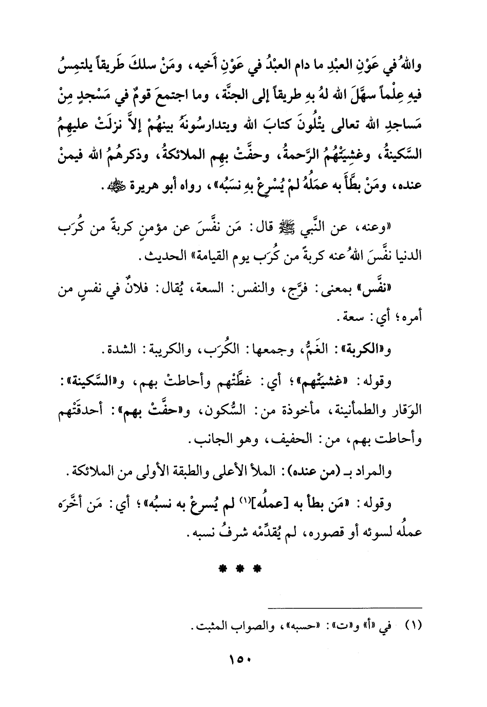 والله في عون العبد ما دام العبد في عون أخيه وومن سلك طريقا يلتمس فيه علما سهل الله له به طريقا إلى الجنة , وما اجتمع قوم في مسجد من مساجد الله تعالى يتلون كتاب الله ويتدارسونه بينهم إلا نزلت عليهم السكينة ووغشيتهم الرحمة , وحفت بهم الملائكة , وذكرهم الله فيمن عنده , ومن بطأ به عمله لم يسرع به نسبه ط, رواه أبو هريرة رضي الله عنه.