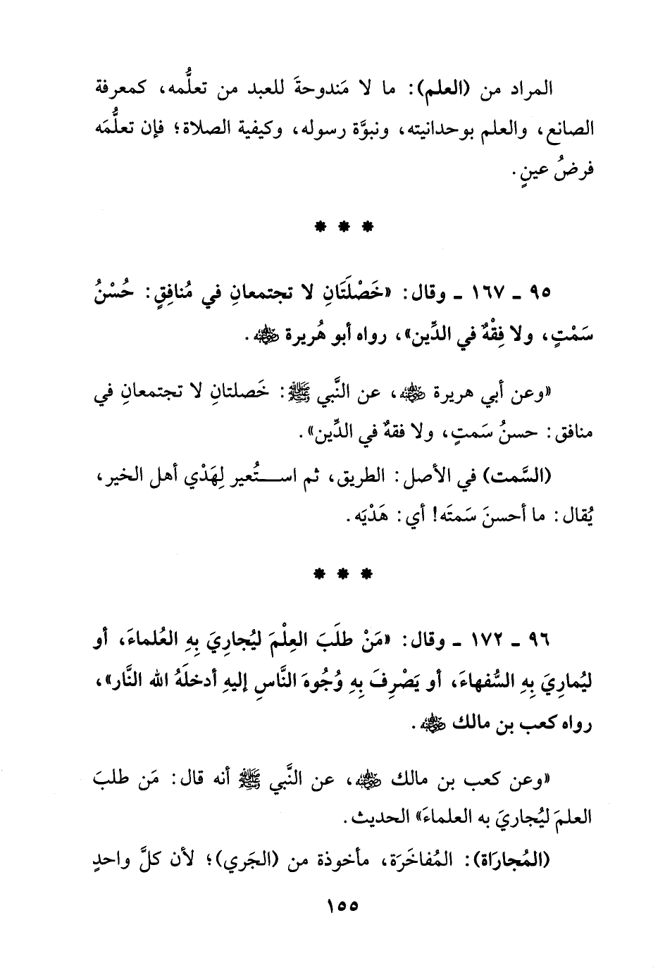 95 – 167 – وقال:" خصلتان لا تجتمعان في منافق: حسن سمت , ولا فقه في الدين " رواه أبو هريرة رضي الله عنه.