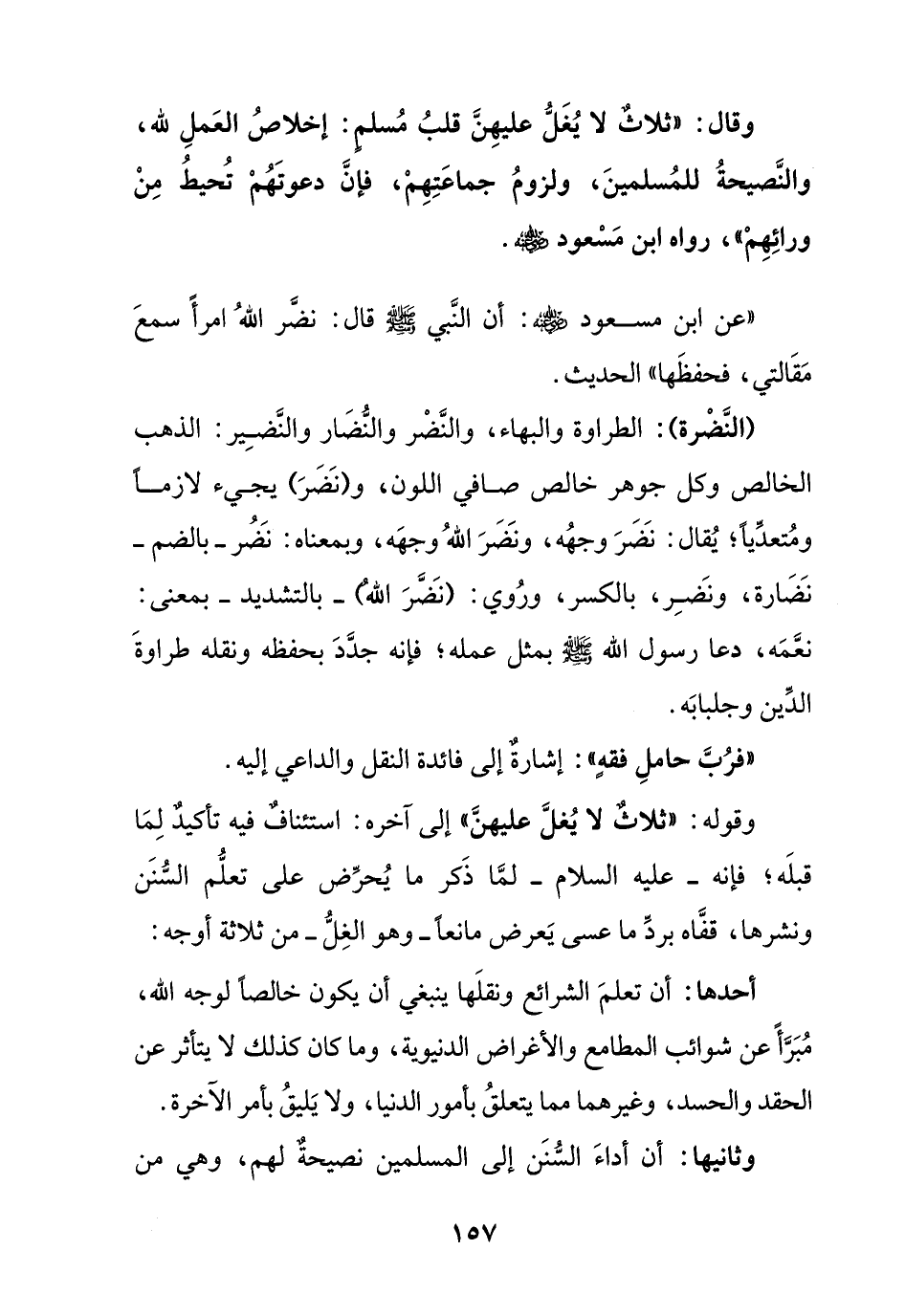 وقوله:" ثلاث لا يغل عليهن " إلى آخره: استئناف فيه تأكيد لما قبله فإنه – عليه السلام – لما ذكر ما يحرض على تعلم السنن ونشرها , قفاه برد ما عسى يعرض مانعا – وهو الغل – من ثلاثة أوجه: