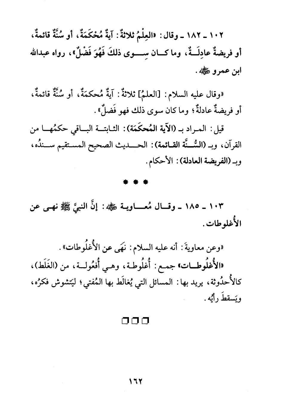 102 – 182 - وقال:" العلم ثلاثة: آية محكمة , أو سنة قائمة , أو فريضة عادلة , وما كان سوى ذلك فهو فضل ", رواه عبد الله ابن عمرو رضي الله عنه.