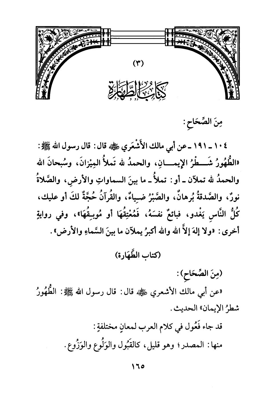 " عن أبي مالك الأشعري رضي الله عنه قال: قال رسول الله صلى الله عليه وسلم: الطهور شطر الإيمان ", الحديث.