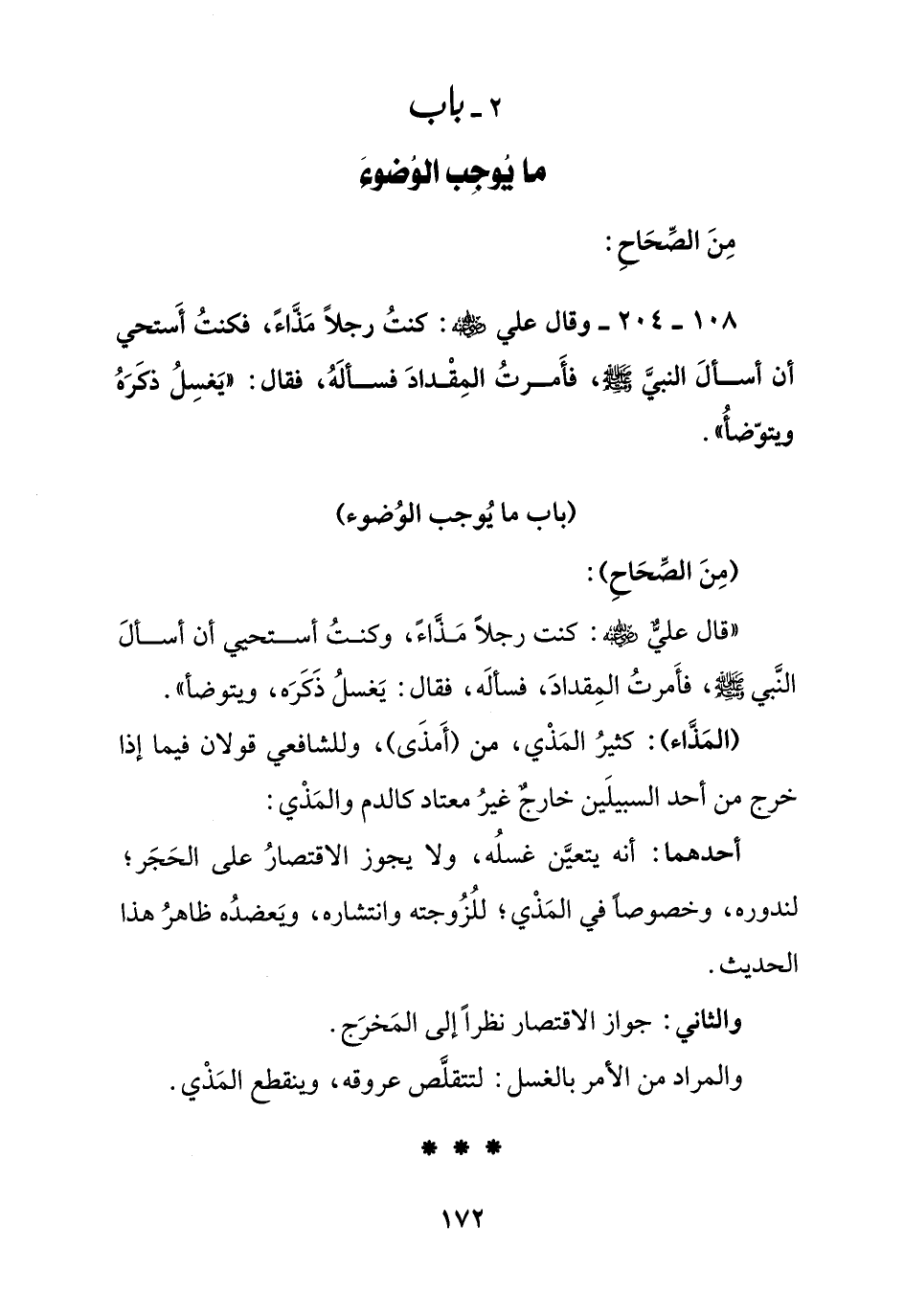 108 - 204 - وقال علي رضي الله عنه: كنت رجلا مذاء , فكنت أستحي أن أسأل النبي صلى الله عليه وسلم , فأمرت المقداد فسأله , فقال: " يغسل ذكره ويتوضأ".