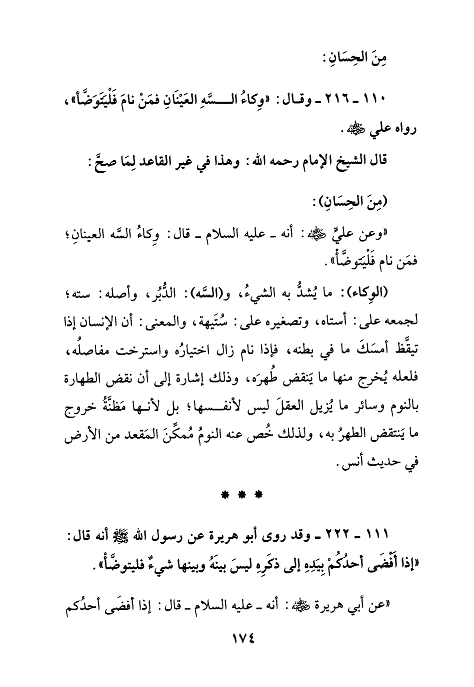 110 - 216 - وقال:" وكاء السه العينان فمن نام فليتوضأ". رواه علي رضي الله عنه.