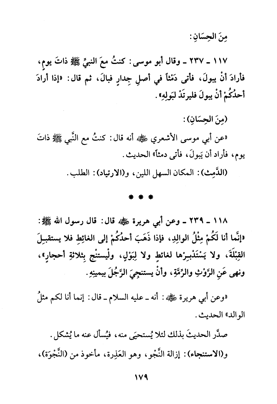 118 – 239 – وعن أبي هريرة رضي الله عنه قال: قال رسول الله صلى الله عليه وسلم: " إنما أنا لكم مثل الوالد , فإذا ذهب أحدكم إلى الغائط فلا يستقبل القبلة , ولا يستدبرها لغائط أو بول , وليستج بثلاثة أحجار , ونهى عن الروث والرمة , وأن يستنجي الرجل بيمينه ".