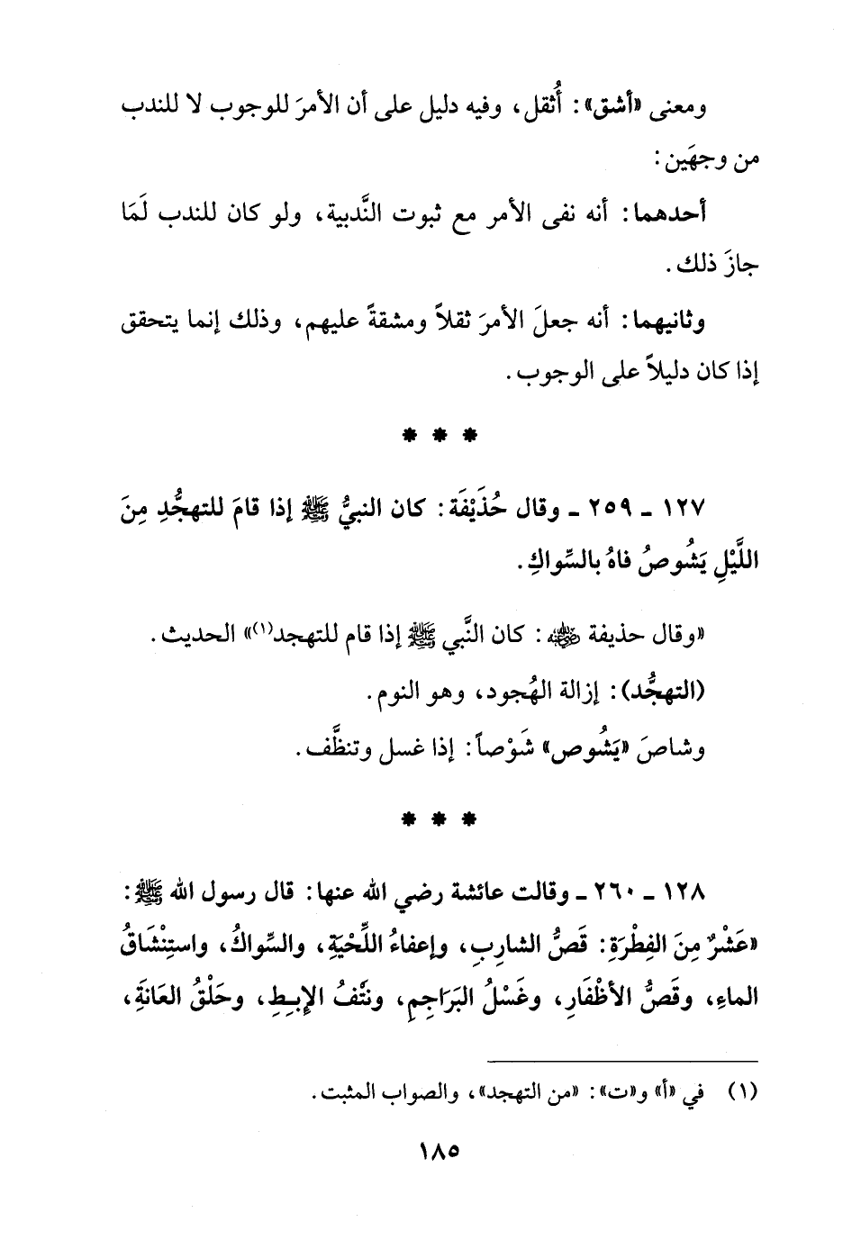 127 - 259 - وقال حذيفة: كان النبي صلى الله عليه وسلم إذا قام للتهجد من الليل يشوص فاه بالسواك ".