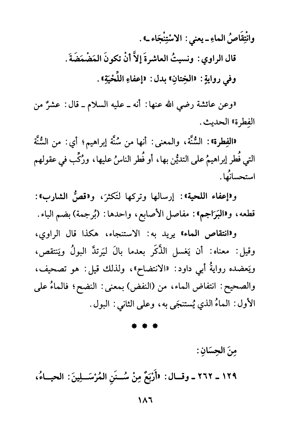 و" إعفاء اللحية ": إرسالها وتركها لتكثر , و" قص الشارب ": قطعه , و" البراجم ": مفاصل الأصابع , واحدها) برجمة) بضم الباء.