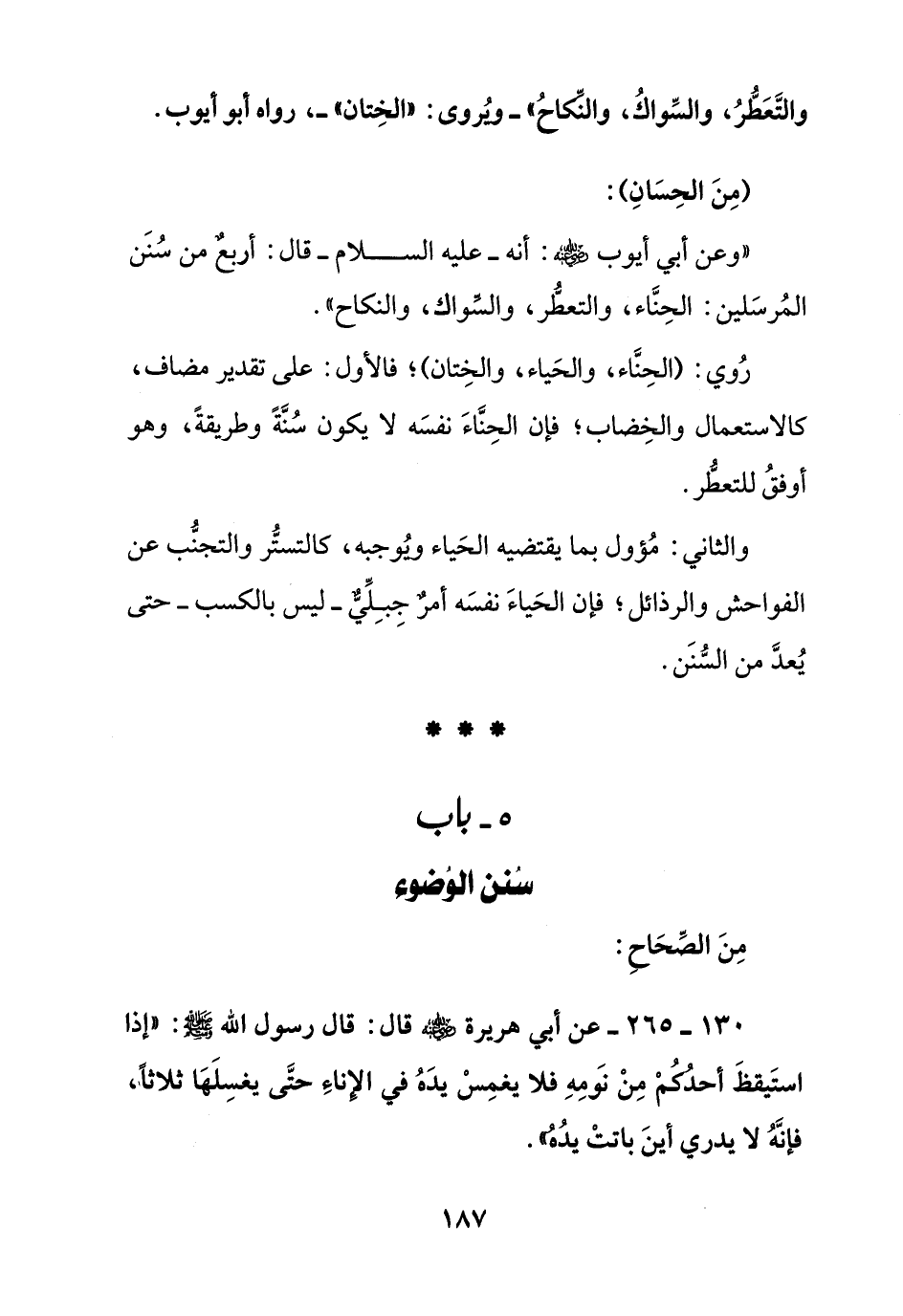130 - 265 - عن أبي هريرة رضي الله عنه قال: قال رسول الله صلى الله عليه وسلم:" إذا استيقظ أحدكم من نومه فلا يغمس يده في الإناء حتى يغسلها ثلاثا , فإنه لا يدري أين باتت يده ".