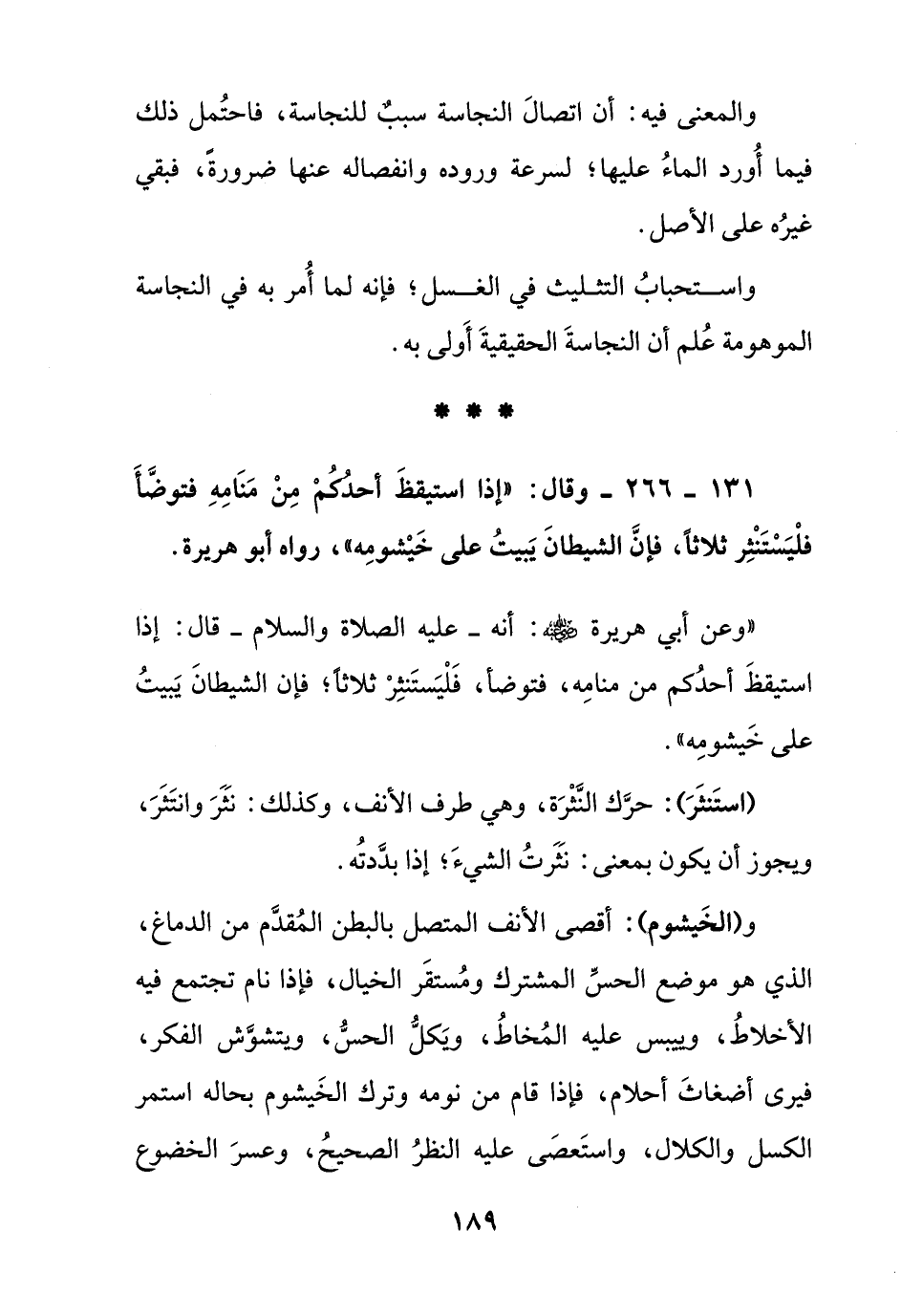 131 – 266 – وقال:" إذا استيقظ أحدكم من نومه فتوضأ فليستنثر ثلاثا , فإن الشيطان يبيت على خيشومه ", رواه أبو هريرة.