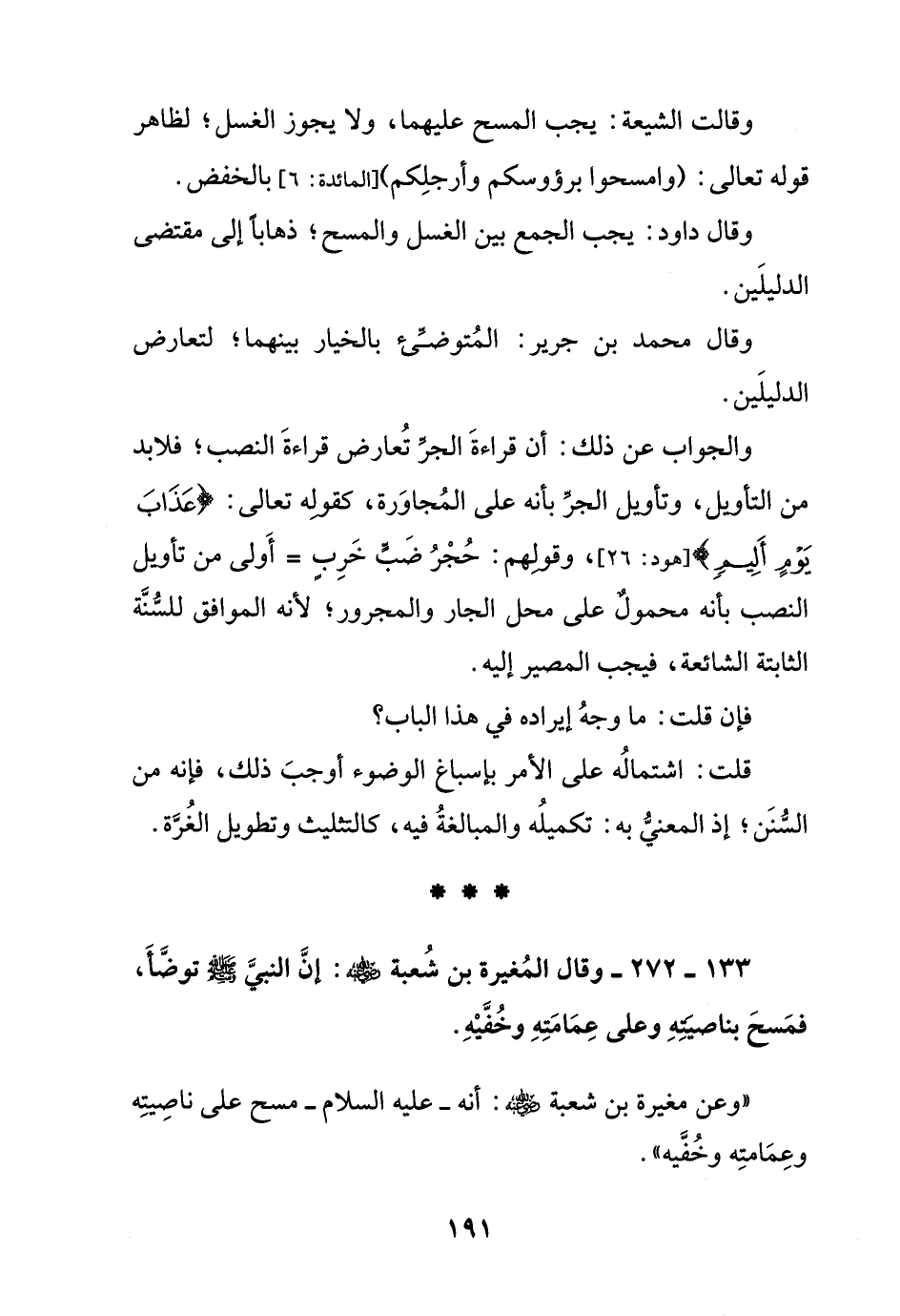 133 – 272 – وقال المغيرة بن شعبة رضي الله عنه: إن النبي صلى الله عليه وسلم توضأ فمسح بناصيته وعلى عمامته وخفيه.