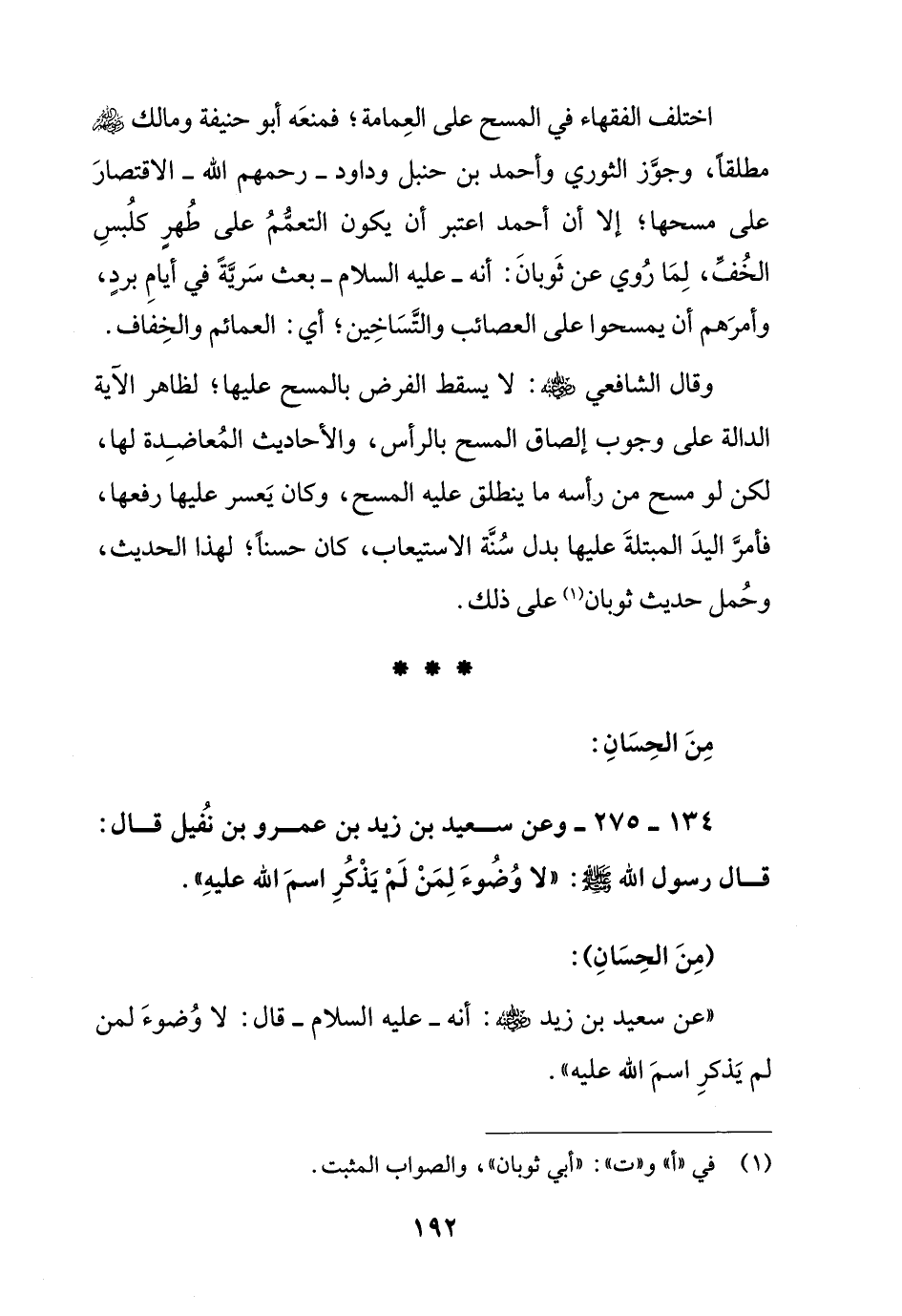 134 – 275 – وعن سعيد بن زيد بن عمرو بن نفيل قال: قال رسول الله صلى الله عليه وسلم:" لا وضوء لمن لم يذكر اسم الله عليه ".