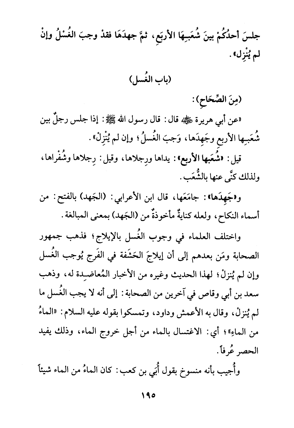 " عن أبي هريرة رضي الله عنه قال: قال رسول الله صلى الله عليه وسلم: إذا جلس رجل بين شعبها الأربع وجهدها , وجب الغسل , وإن لم ينزل ".
