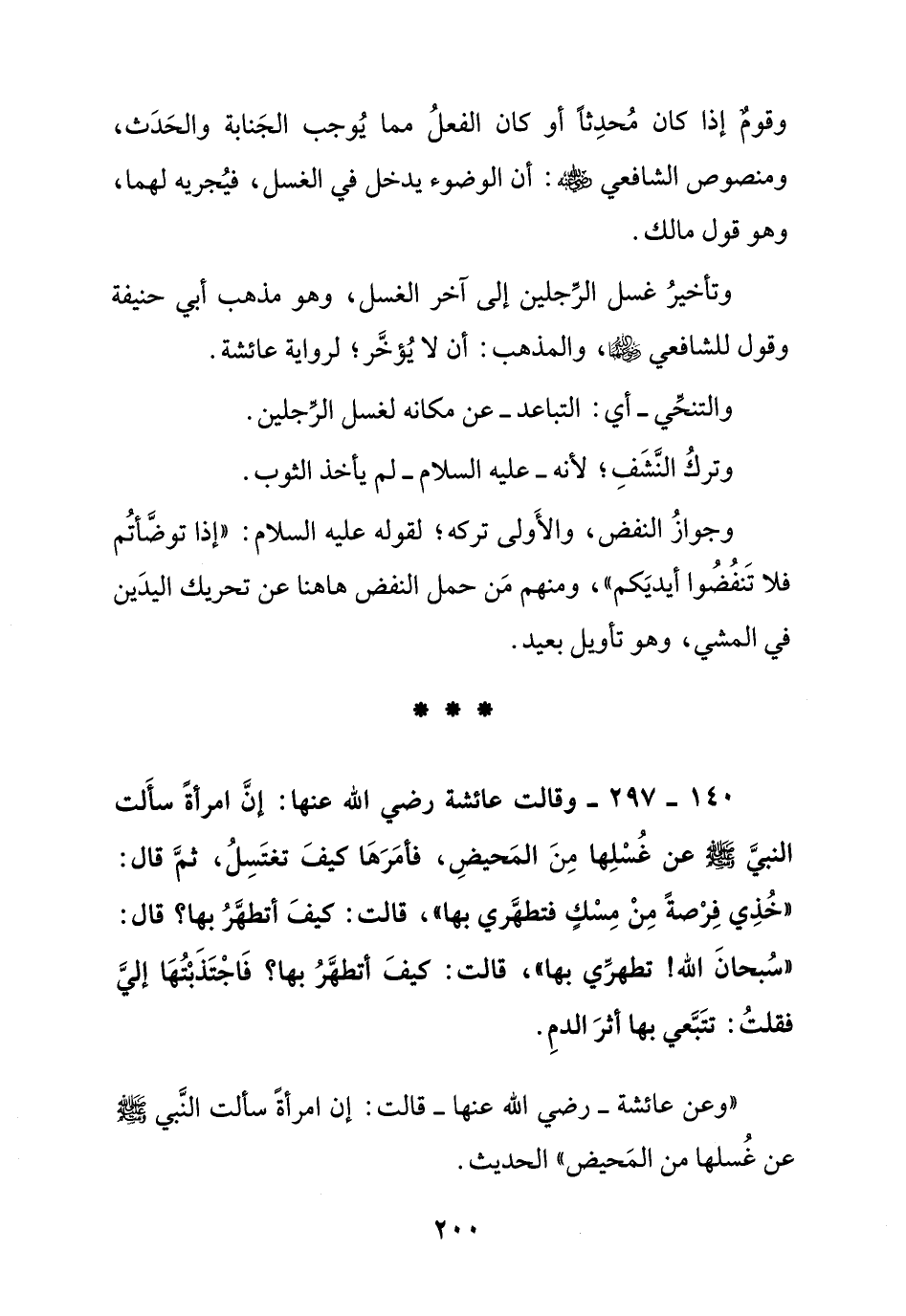 140 – 297 – وقالت عائشة رضي الله عنها: إن امرأة سألت النبي صلى الله عليه وسلم عن غسلها من المحيض , فأمرها كيف تغتسل , ثم قال: خذي فرصة من مسك فتطهري بها ", قالت: كيف أتطهر بها؟ قال: "سبحان الله! تطهري بها " قالت: كيف أتطهر بها؟ فاجتذبتها إلي فقلت: تتبعي بها أثر الماء ".