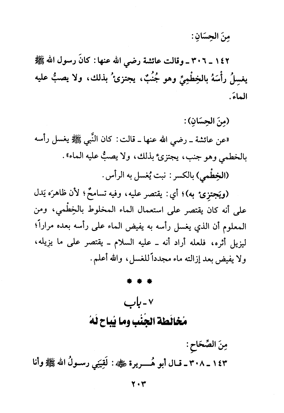 142 - 306 - وقالت عائشة رضي الله عنها: كان رسول الله صلى الله عليه وسلم يغسل رأسه بالخطمي وهو جنب يجتزيء بذلك , ولا يصب عليه الماء ".