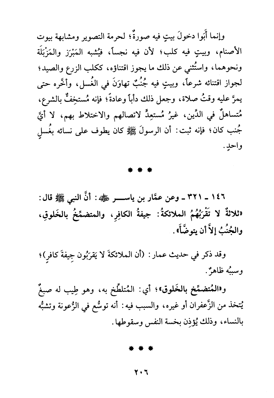 146 - 321 - وعن عمار بن ياسر رضي الله عنه: أن النبي صلى الله عليه وسلم قال: "ثلاثة لا تقربهم الملائكة: جيفة الكافر , والمتضمخ بالخلوق , والجنب إلا أن يتوضأ ".