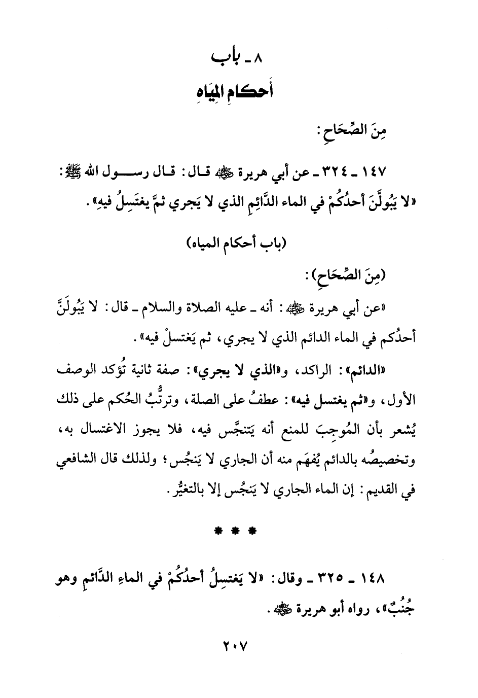 148 - 325 - وقال:" لا يغتسل أحدكم في الماء الدائم وهو جنب ", رواه أبو هريرة رضي الله عنه.