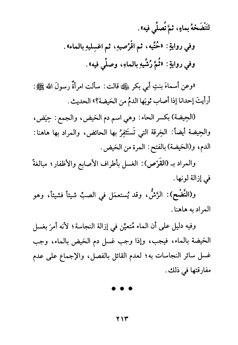 " وعن أسماء بنت أبي بكر رضي الله عنهما قالت: سألت امرأة رسول الله صلى الله عليه وسلم: أرأيت إحدانا إذا أصاب ثوبها الدم من الحيضة؟ " الحديث.