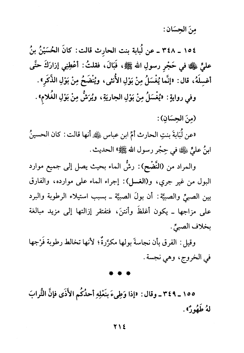 154 – 348 – عن لبابة بنت الحارث قالت: كان الحسين بن علي رضي الله عنهما في حجر رسول الله صلى الله عليه وسلم , فبال , فقلت: أعطني إزارك حتى أغسله , قال: " إنما يغسل من بول الأنثى , وينضح من بول الذكر ".