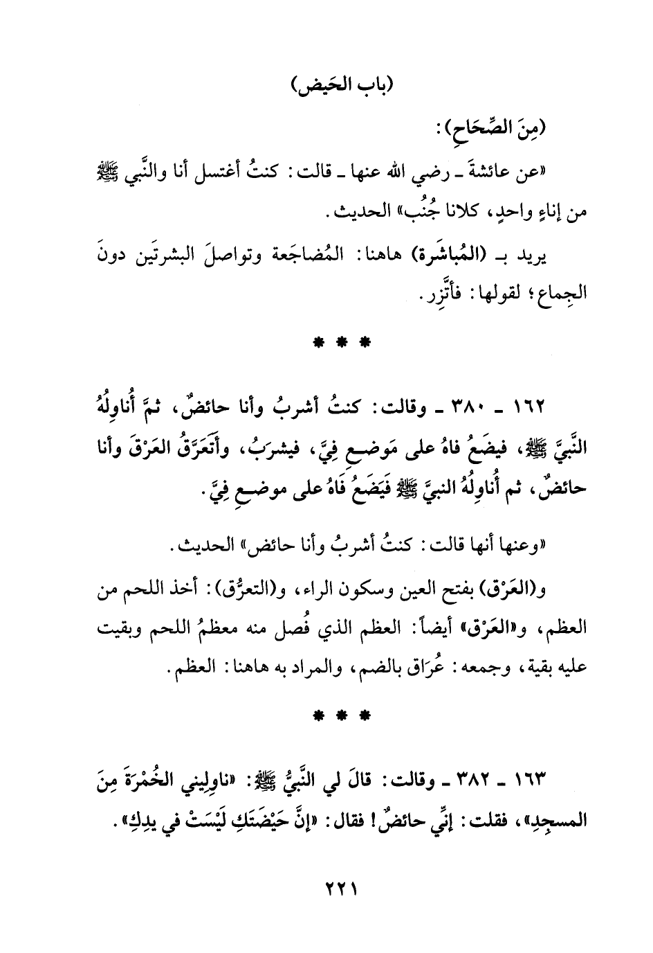 162 - 380 - وقالت: كنت أشرب وأنا حائض , ثم أناوله النبي صلى الله عليه وسلم فيضع فاه على موضع في فيشرب , وأتعرق العرق وأنا حائض , ثم أناوله النبي صلى الله عليه وسلم فيضع فاه على موضع في.