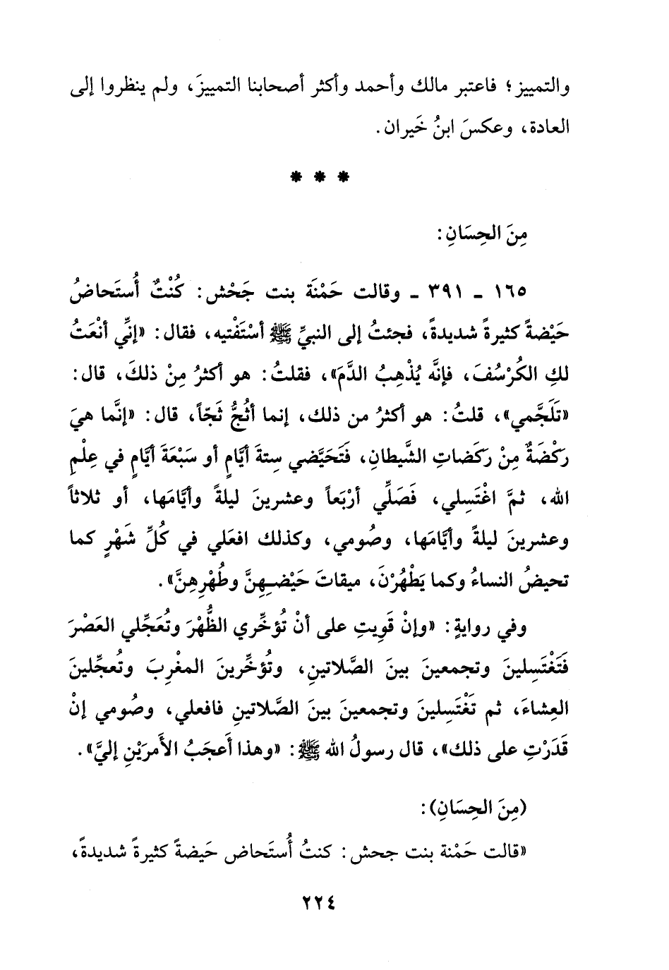 165 – 391 – وقالت حمنة بنت جحش: كنت أستحاض حيضة كثيرة شديدة , فجئت إلى النبي صلى الله عليه وسلم أستفتيه , فقال:" إني أنعت لك الكرسف , فإنه يذهب الدم ", فقلت: هو أكثر من ذلك , قال: " تلجمي " قلت: هو أكثر من ذلك إنما أثج ثجا , قال:" إنما هي ركضة من ركضات الشيطان , فتحيضي ستة أيام أو سبعة أيام في علم الله , ثم اغتسلي , فصلي أربعا وعشرين ليلة وأيامها , أو ثلاثا وعشرين ليلة وأيامها , وصومي , وكذلك افعلي في كل شهر كما تحيض النساء وكما يطهرن , ميقات حيضهن وطهرهن ".