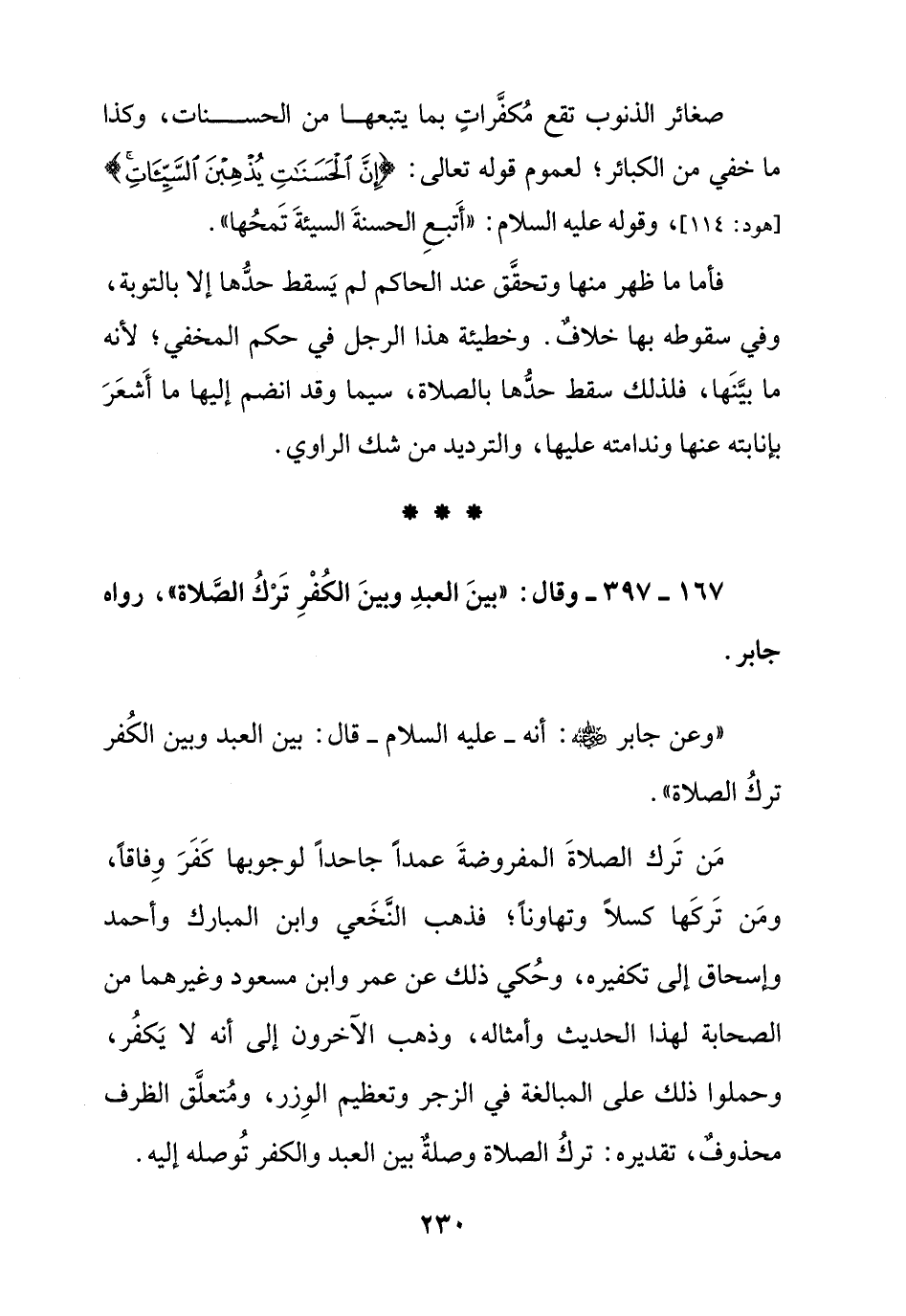 167 - 397 - وقال:" بين العبد وبين الكفر ترك الصلاة " رواه جابر.