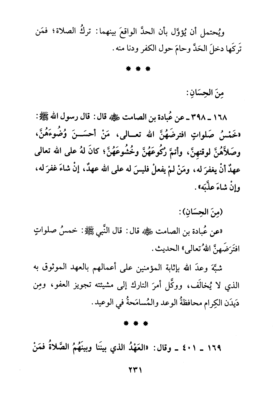 168 - 398 - عن عبادة بن الصامت رضي الله عنه قال: قال رسول الله صلى الله عليه وسلم:" خمس صلوات افترضهن الله تعالى , من أحسن وضوءهن , وصلاهن لوقتهن , وأتم ركوهن وخشوعهن , كان له على الله تعالى عهد أن يغفر له , ومن لم يغفل فليس له على الله عهد , إن شاء غفر له , وإن شاء عذبه ".
