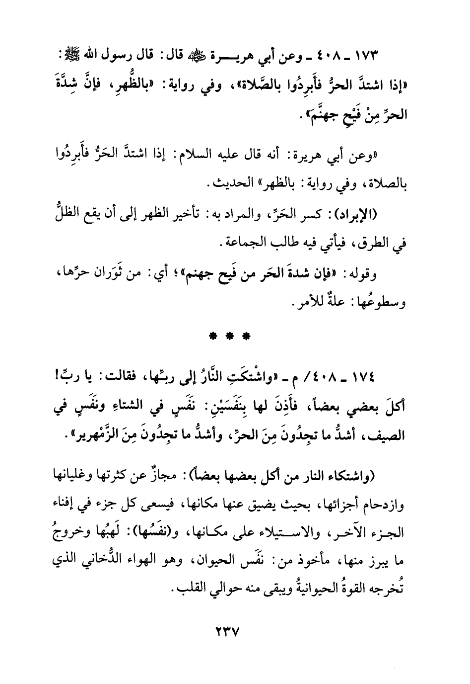 174 - 408 - م - " واشتكت النار إلى ربها , فقالت: يا رب! أكل بعضي بعضا , فأذن لها بنفسين: نفس في الشتاء ونفس في الصيف , أشد ما تجدون من الحر , وأشد ما تجدون من الومهرير ".