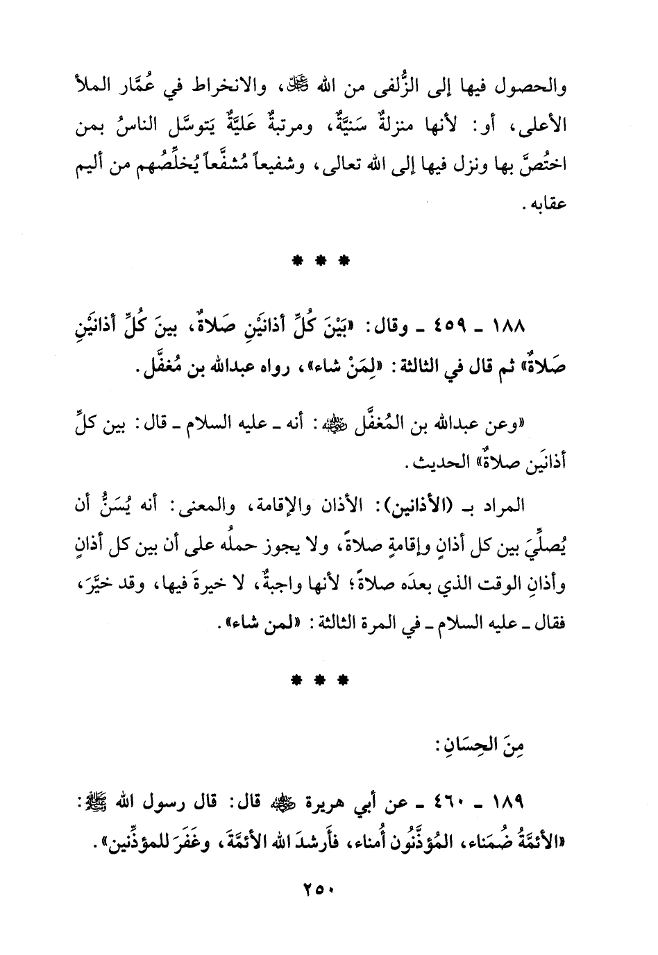 188 - 459 - وقال: " بين كل أذانين صلاة , بين كل أذانين صلاة " ثم قال في الثالثة: " لمن شاء ", رواه عبد الله بن مغفل.