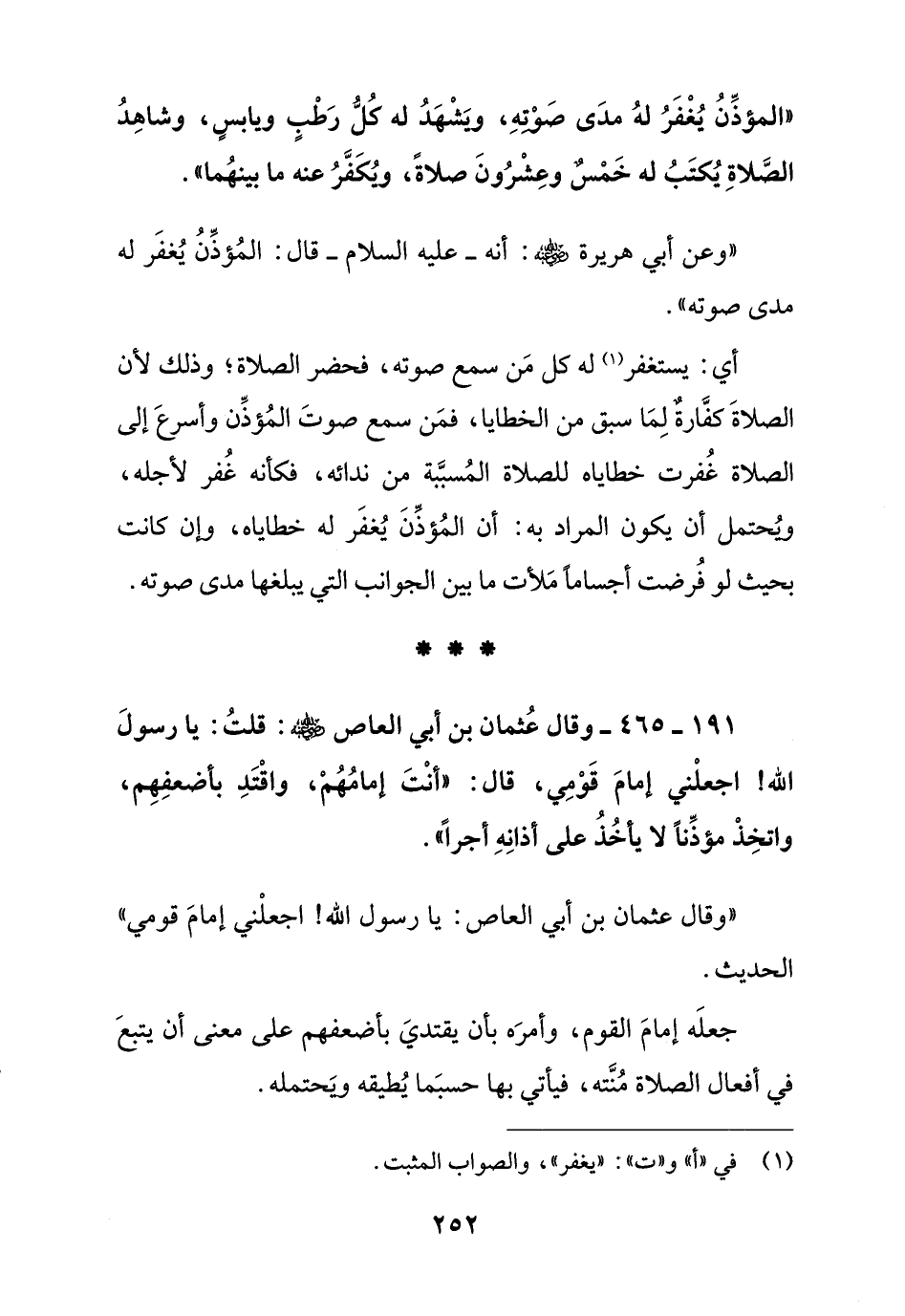 191 - 465 - وقال عثمان بن أبي العاص رضي الله عنه: قلت: يا رسول الل! اجعلني إمام قومي , قال: " أنت إمامهم , واقتد بأضعفهم , واتخذ مؤذنا لا يأخذ على أذانه أجرا ".