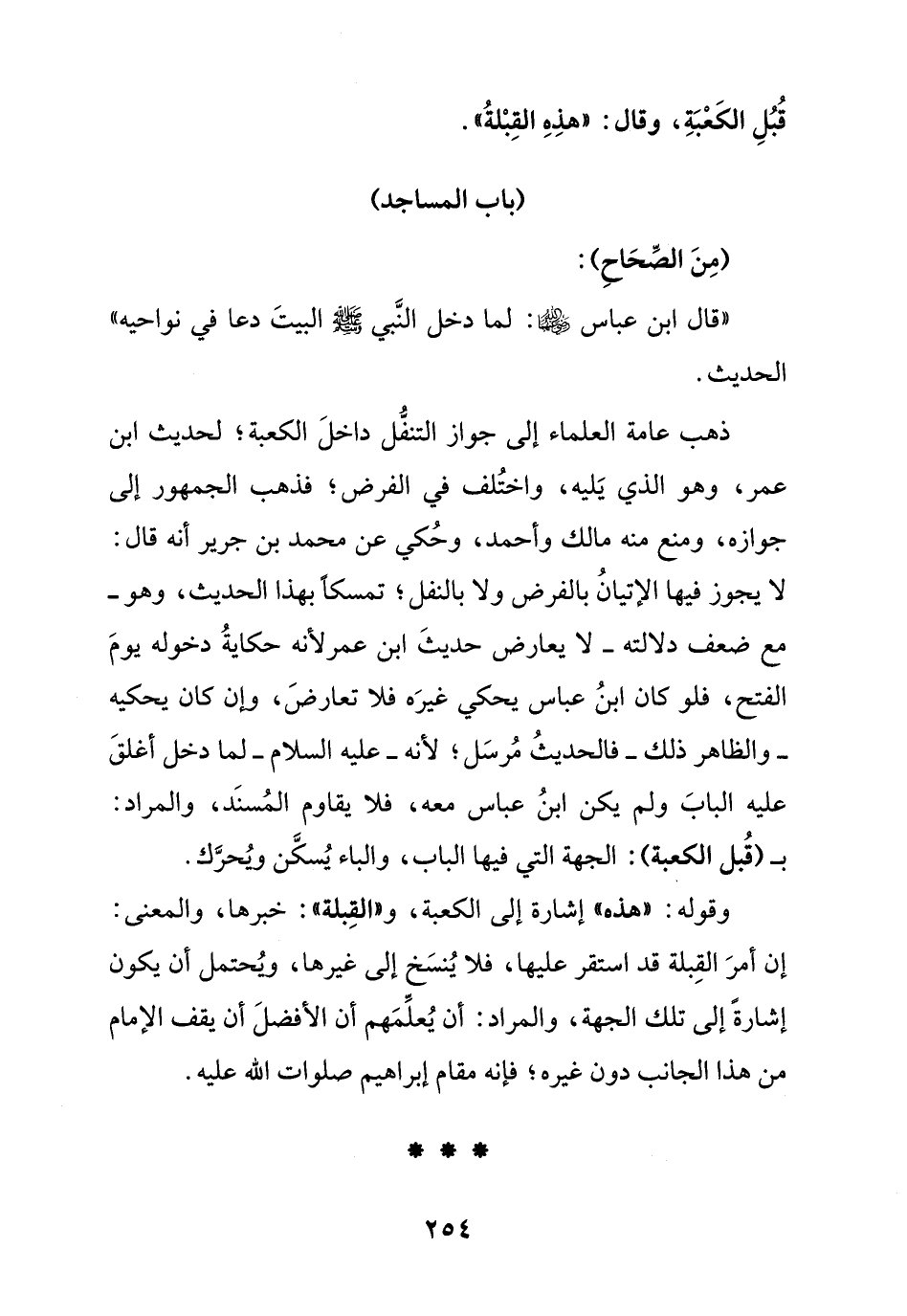 ذهب عامة العلماء إلى جواز التنفل داخل الكعبة , لحديث ابن عمر , وهو الذي يليه , واختلف في الفرض , فذهب الجمهور إلى جوازه , ومنع منه مالك وأحمد , وحكي عن محمد بن جرير أنه قال: لا يجوز فيها الإتيان بالفرض ولا بالنفل , تمسكا بهذا الحديث , وهو – مع ضعف دلالته – لا يعارض حديث ابن عمر لأنه حكاية دخوله يوم الفتح , فلو كان ابن عباس يحكي غيره فلا تعارض , وإن كان يحكيه – والظاهر ذلك – فالحديث مرسل , لأنه – عليه السلام – لما دخل أغلق عليه الباب ولم يكن ابن عباس معه , فلا يقاوم المسند , والمراد: بـ (قبل الكعبة): الجهة التي فيها الباب , والباء يسكن ويحرك.
