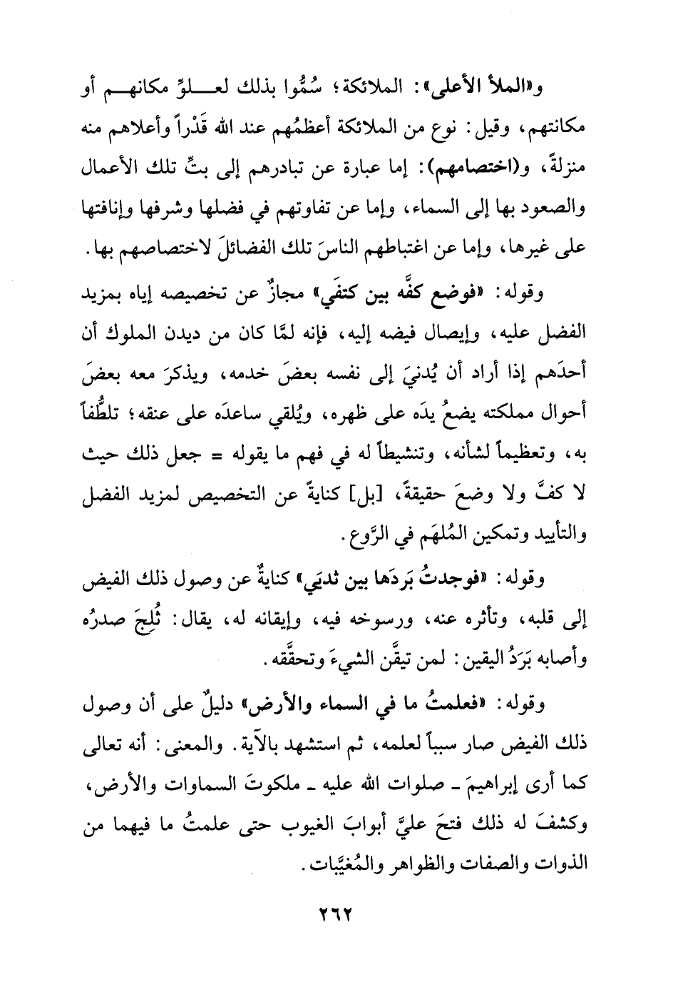 و" الملأ الأعلى ": الملائكة , سموا بذلك لعلو مكانهم أو مكانتهم , وقيل: نوع من الملائكة أعظمهم عند الله قدرا وأعلاهم منه منزلة , و (اختصاصهم): إما عبارة عن تبادرهم إلى بت تلك الأعمال والصعود بها إلى السماء , وإما عن تفاوتهم في فضلها وشرفها وإناقتها على غيرها , وإما عن اغتباطهم الناس تلك الفضائل لاختصاصهم بها.