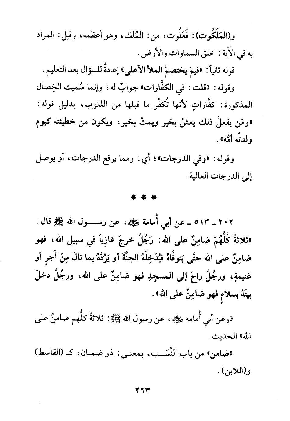 202 – 513 – عن أبي أمامة رضي الله عنه , عن رسول الله صلى الله عليه وسلم قال: " ثلاثة كلهم ضامن على الله: رجل خرج غازيا في سبيل الله , فهو ضامن على الله حتى يتوفاه فيدخله الجنة أو يرده بما نال من أجر أو غنيمة , ورجل راح إلى المسجد فهو ضامن على الله ,ورجل دخل بيته بسلام فهو ضامن على الله ".