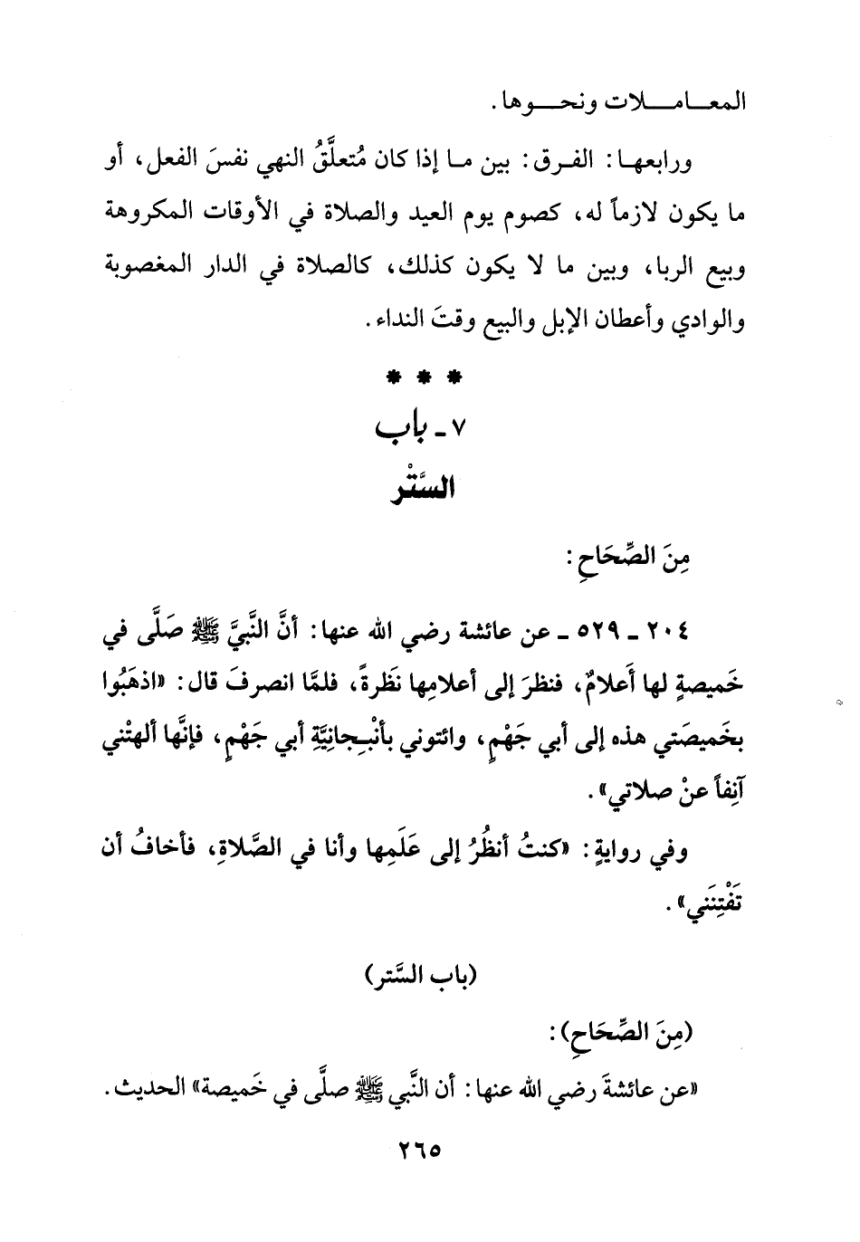 204 - 529 - عن عائشة رضي الله عنها: أن النبي صلى الله عليه وسلم صلى في خميصة لها أعلام , فنظر إلى أعلامها نظرة , فلما انصرف قال: " اذهبوا بخميصتي هذه إلى أبي جهم , وائتوني بأنبجانية أبي جهم , فإنها ألهتني آنفا عن صلاتي ".