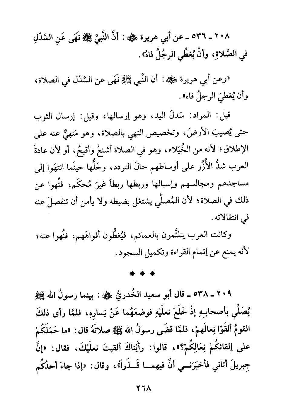 208 - 536 - عن أبي هريرة رضي الله عنه: أن النبي صلى الله عليه وسلم نهى عن السدل في الصلاة , وأن يعطي الرجل فاه ".
