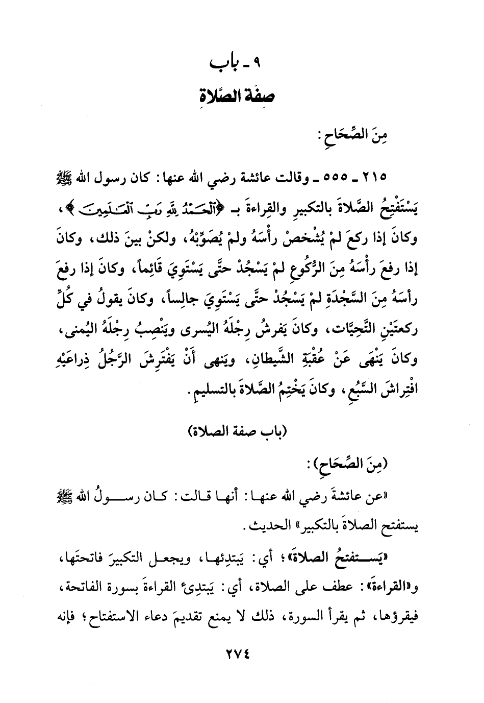 215 - 555 - وقالت عائشة رضي الله عنها: كان رسول الله صلى الله عليه وسلم يستفتح الصلاة بالتكبير والقراءة بـ {الحمد لله رب العالمين} , وكان إذا ركع لم يشخص رأسه ولم يصوبه , ولكن بين ذلك , وكان إذا رفع رأسه من الركوع لم يسجد حتى يستوي قائما , وكان إذا رفع رأسه من السجدة لم يسجد حتى يستوي جالسا , وكان يقول في كل ركعتين التحيات , وكان يفرش رجله اليسرى وينصب رجله اليمنى , وكان ينهى عن عقبة الشيطان , وينهى أن يفترش الرجل ذراعيه افتراش السبع , وكان يختم الصلاة بالتسليم.