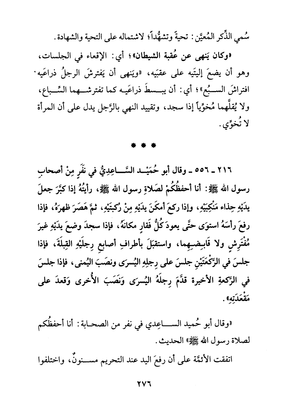 216 - 556 - وقال أبو حميد الساعدي في نفر من أصحاب رسول الله صلى الله عليه وسلم: أنا أحفظكم لصلاة رسول الله صلى الله عليه وسلم , رأيته إذا كبر جعل يديه حذاء منكبيه , وإذا ركع أمكن يديه من ركبتيه , ثم هصر ظهره , فإذا رفع رأسه استوى حتى يعود كل فقار مكانه , فإذا سجد وضع يديه غير مفترش ولا قابضهما , واستقبل بأطراف أصابع رجليه القبلة , فإذا جلس في الركعتين جلس على رجله اليسرى ونصب اليمنى , فإذا جلس في الركعة الأخيرة قدم رجله اليسرى ونصب الأخرى وقعد على مقعدته ".