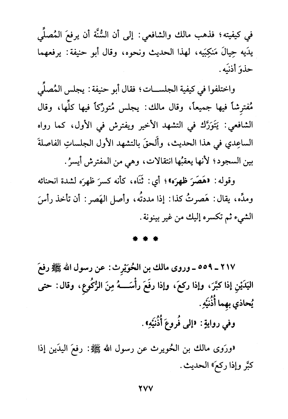 217 - 559 - وروى مالك بن الحويرث: عن رسول الله صلى الله عليه وسلم رفع اليدين إذا كبر , وإذا ركع , وإذا رفع رأسه من الركوع , وقال: حتى يحاذي بهما أذنيه.