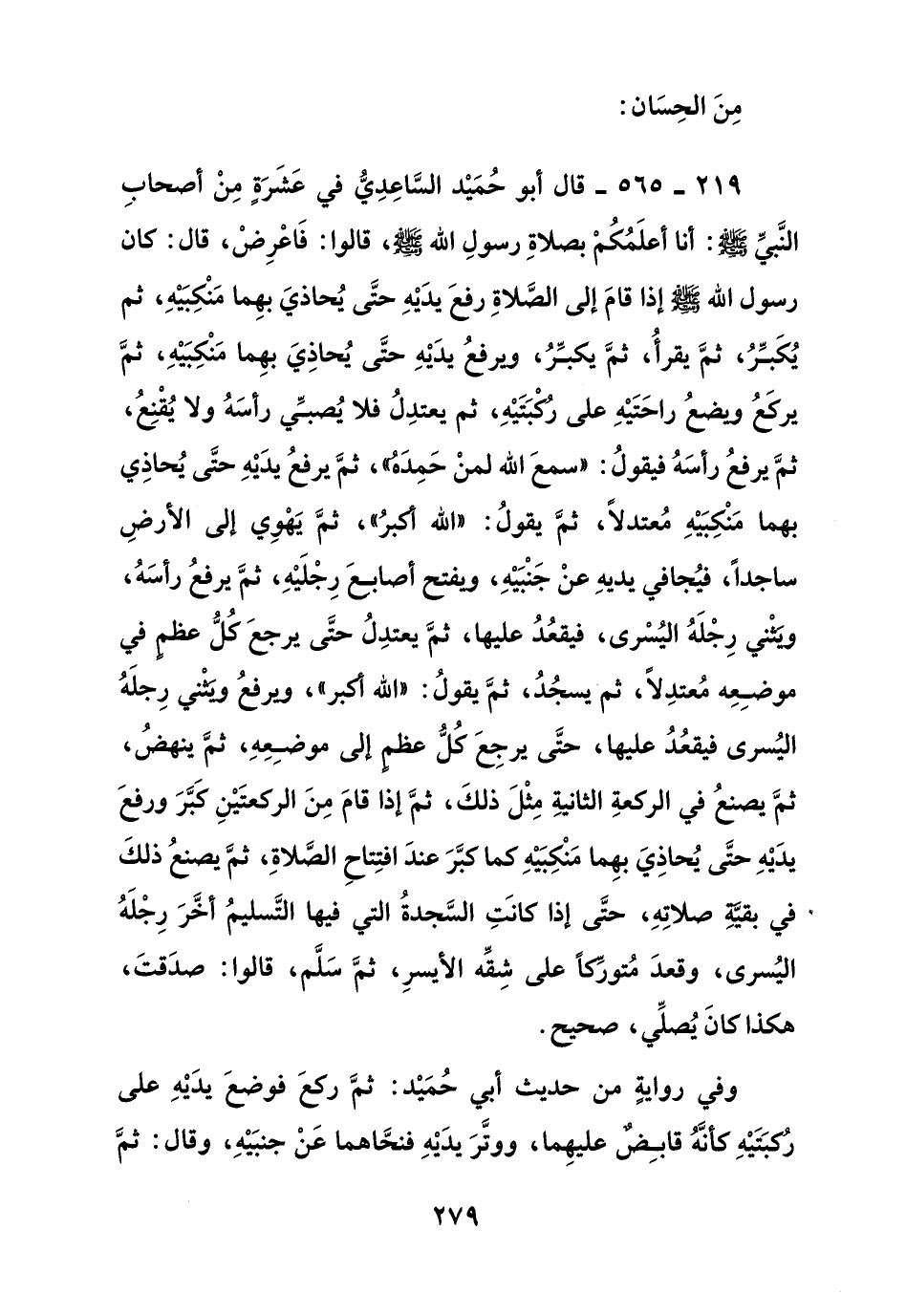 219 - 565 - قال أبو حميد الساعدي في عشرة من أصحاب النبي صلى الله عليه وسلم: أنا أعلمكم بصلاة رسول الله صلى الله عليه وسلم , قالوا: فاعرض , قال: كان رسول الله صلى الله عليه وسلم إذا قام إلى الصلاة رفع يديه حتى يحاذي بهما منكبيه , ثم يكبر , ثم يقرأ , ثم يكبر , ويرفع يديه حتى يحاذي بهما منكبيه , ثم يركع ويضع راحتيه على ركبتيه , ثم يعتدل فلا يصبي رأسه ولا يقنع , ثم يرفع رأسه فيقول: " سمع الله لمن حمده " , ثم يرفع يديه حتى يحاذي بهما منكبيه معتدلا , ثم يقول: " الله أكبر " , ثم يهوي إلى الأرض ساجدا , فيجافي يديه عن جنبيه , ويفتح أصابع رجليه , ثم يرفع رأسه , ويثني رجله اليسرى , فيقعد عليها , ثم يعتدل حتى يرجع كل عظم في موضعه معتدلا , ثم يسجد , ثم يقول " الله أكبر " ويرفع ويثني رجله اليسرى فيقعد عليها , حتى يرجع كل عظم على موضعه , ثم ينهض , ثم يصنع في الركعة الثانية مثل ذلك , ثم إذا قام من الركعتين كبر ورفع يديه حتى يحاذي بهما منكبيه كما كبر عند افتتاح الصلاة , ثم يصنع ذلك في بقية صلاته , حتى إذا كانت السجدة التي فيها التسليم أخر رجله اليسرى , وقعد متوركا على شقه الأيسر , ثم سلم , قالوا: صدقت هكذا كان يصلي , صحيح.