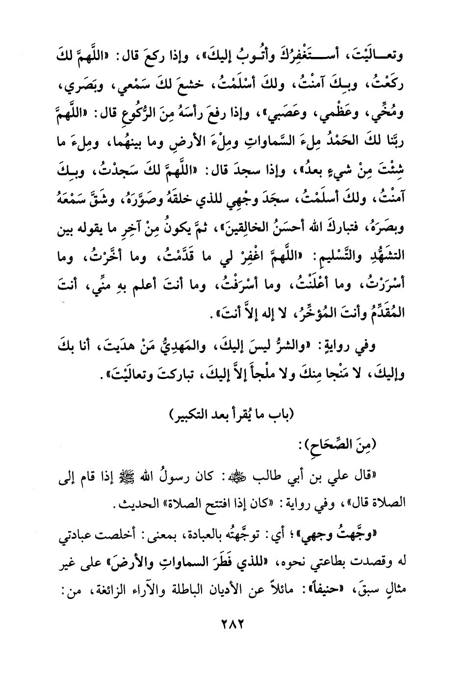 وتعاليت , أستغفرك وأتوب إليك ", وإذا ركع قال: " اللهم لك ركعت , وبك آمنت , ولك أسلمت , خشع لك سمعي , وبصري , ومخي , وعظمي , وعصبي " , وإذا رفع رأسه من الركوع قال: " اللهم ربنا لك الحمد ملء السماوات وملء الأرض وما بينهما , وملء ما ما شئت من شيء بعد ", وإذا سجد قال: " اللهم لك سجدت , وبك آمنت , ولك أسلمت , سجد وجهي للذي خلقه وصوره , وشق سمعه وبصره , فتبارك الله أحسن الخالقين ", ثم يكون من آخر ما يقوله بين التشهد والتسليم: " اللهم اغفر لي ما قدمت , وما أخرت , وما أسررت , وما أعلنت وما أسرفت , وما أنت أعلم به مني , أنت المقدم وأنت المؤخر , لا إله إلا أنت ".