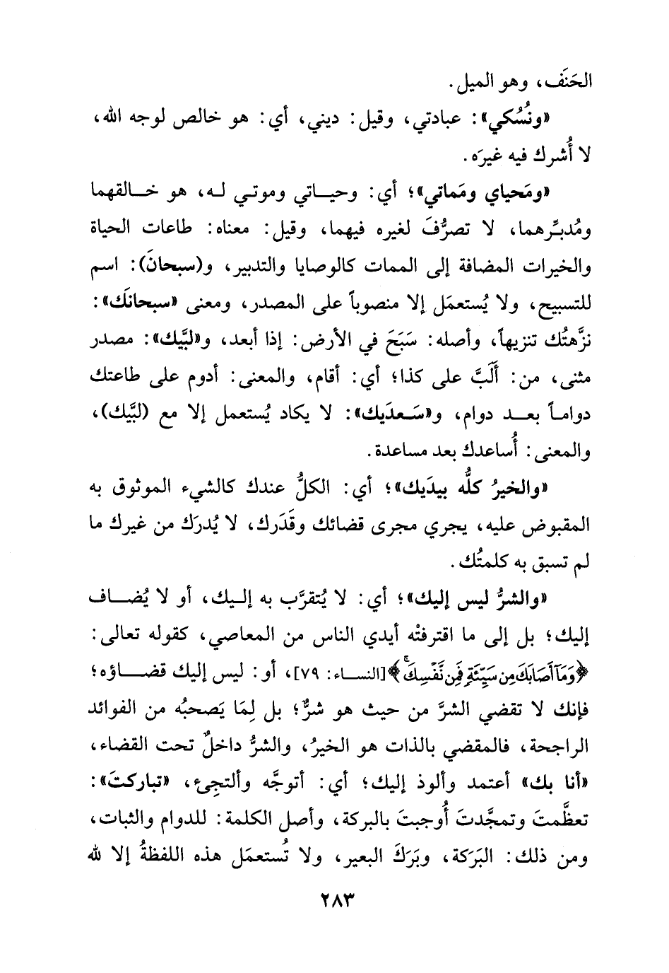 " ومحياي ومماتي " أي: وحياتي وموتي له , هو خالقها ومدبرهما , لا تصرف لغيره فيهما , وقيل: معناه: طاعات الحياة والخيرات المضافة إلى الممات كالوصايا والتدبير , و (سبحان): اسم للتسبيح , ولا يستعمل إلا منصوبا على المصدر , ومعنى " سبحانك ": نزهتك تنزيها , وأصله: سبح في الأرض: إذا أبعد , و" لبيك ": مصدر مثنى ,من: ألب على كذا , أي: أقام , والمعنى: أدوم على طاعتك دواما بعد دوام , و" سعديك ": لا يكاد يستعمل إلا مع (لبيك) والمعنى: أساعدك بعد مساعدة.