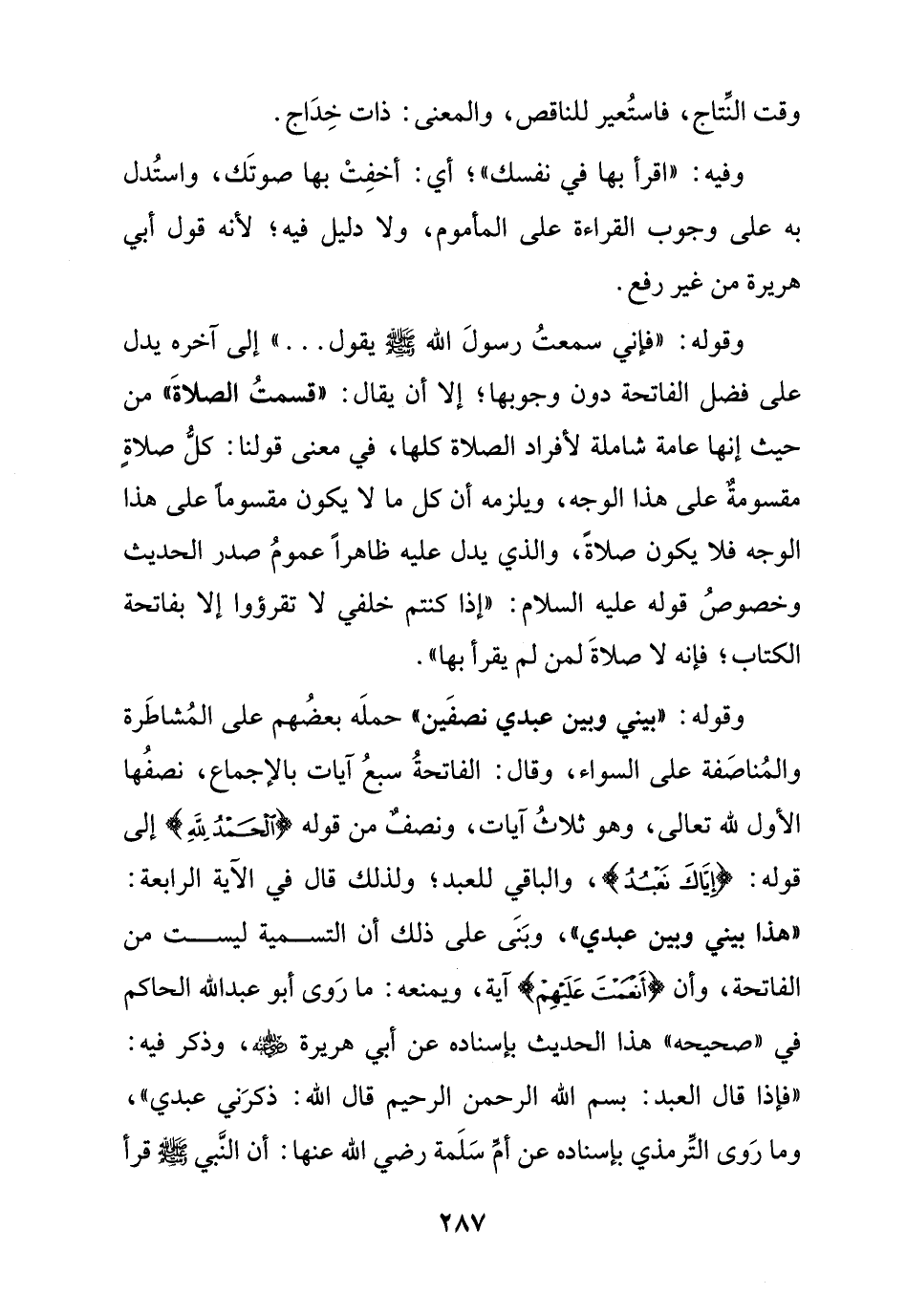 وقوله: " فإني سمعت رسول الله صلى الله عليه وسلم يقول ... " إلى آخره يدل على فضل الفاتحة دون وجوبها , إلا أن يقال: " قسمت الصلاة " من حيث إنها عامة شاملة لأفراد الصلاة كلها , في معنى قولنا: كل صلاة مقسومة على هذا الوجه , ويلزمه أن كل ما لا يكون مقسوما على هذا الوجه فلا يكون صلاة , والذي يدل عليه ظاهرا عموم صدر الحديث وخصوص قوله عليه السلام: " إذا كنتم خلفي لا تقرؤوا إلا بفاتحة الكتاب , فإنه لا صلاة لمن لم يقرأ بها ".