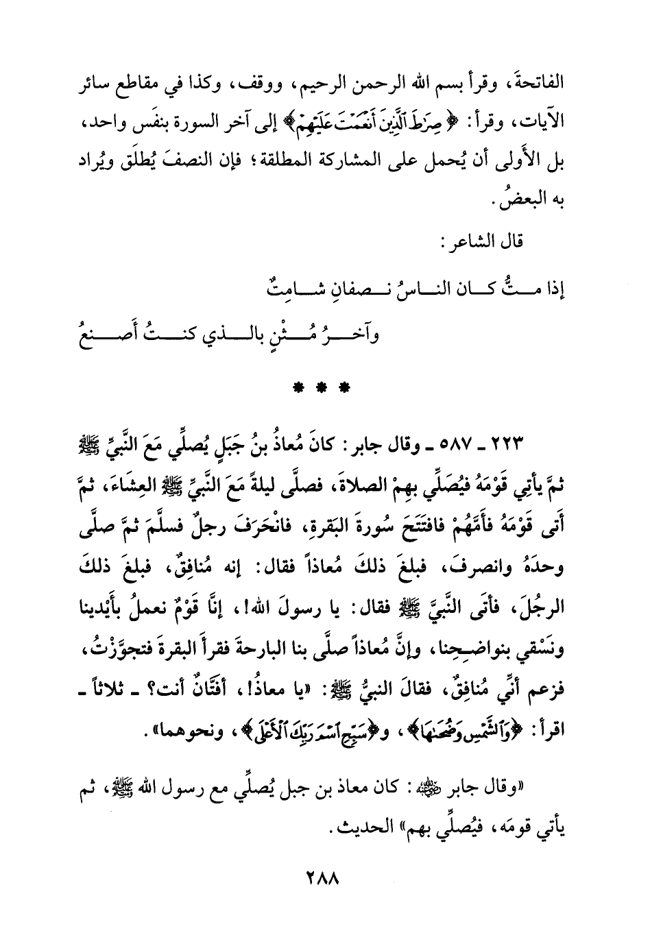 223 - 587 - وقال جابر: كان معاذ بن جبل يصلي مع النبي صلى الله عليه وسلم ثم يأتي قومه فيصلي بهم الصلاة , فصلى ليلة مع النبي صلى الله عليه وسلم العشاء , ثم أتى قومه فأمهم فافتتح سورة البقرة , فانحرف رجل فسلم ثم صلى وحده وانصرف , فبلغ ذلك معاذا فقال: إنه منافق , فبلغ ذلك الرجل , فأتى النبي صلى الله عليه وسلم فقال: يا رسول الله! إنا قوم نعمل بأيدينا ونسقي بنواضحنا , وإن معاذا صلى بنا البارحة فقرأ البقرة فتجوزت , فزعم أني منافق , فقال النبي صلى الله عليه وسلم: " يا معاذ! أفتان أنت؟ - ثلاثا - اقرأ: {والشمس وضحاها} ,و {سبح اسم ربك الأعلى} , ونحوهما ".