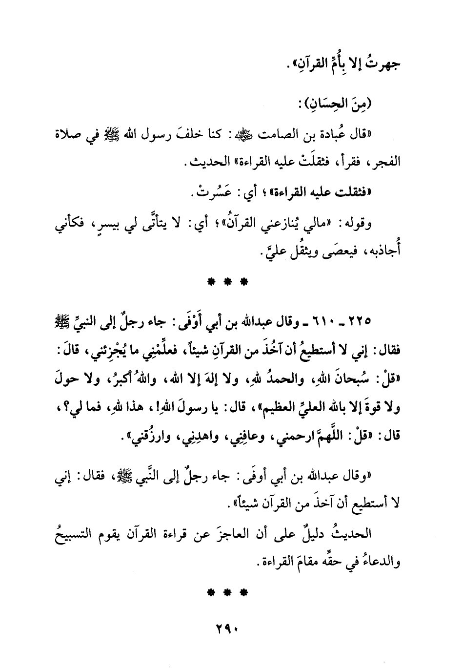 225 - 610 - وقال عبد الله بن أبي أوفى: جاء رجل إلى النبي صلى الله عليه وسلم فقال: إني لا أستطيع أن آخذ من القرآن شيئا، فعلمني ما يجزئني، قال: (قل: سبحان الله، والحمد لله، ولا إله إلا الله، والله أكبر، ولا حول ولا قوة إلا بالله العلي العظيم)، قال: يا رسول الله! هذا لله، فما لي؟، قال: (قل: اللهم ارحمني، وعافني، واهدني، وارزقني).