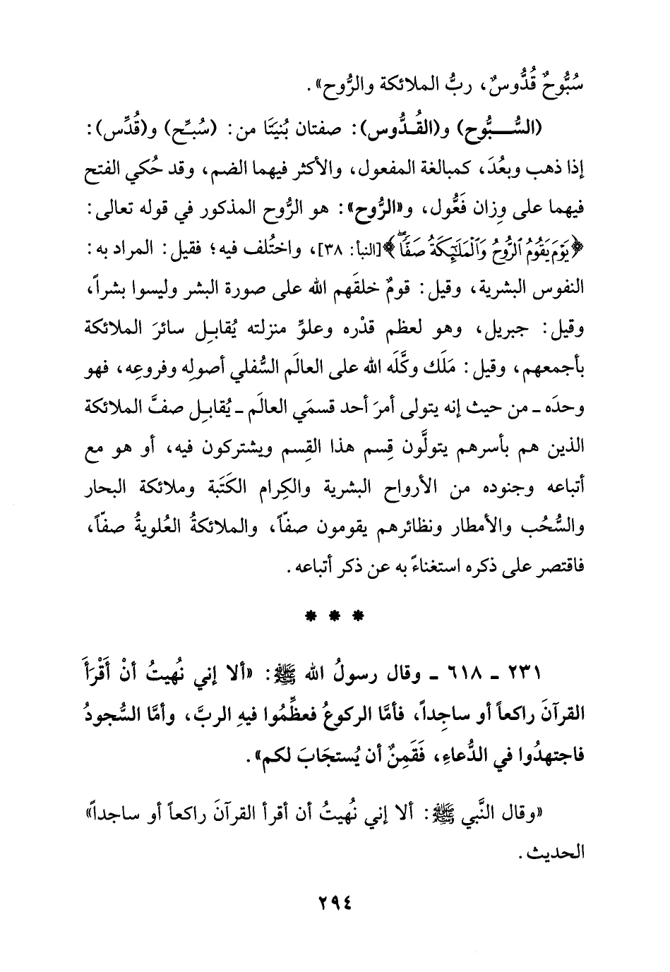 231 - 618 - وقال رسول الله صلى الله عليه وسلم: " ألا إني نهيت أن أقرأ القرآن راكعا أو ساجدا , فأما الركوع فعظموا فيه الرب , وأما السجود فاجتهدوا في الدعاء , فقمن أن يستجاب لكم ".