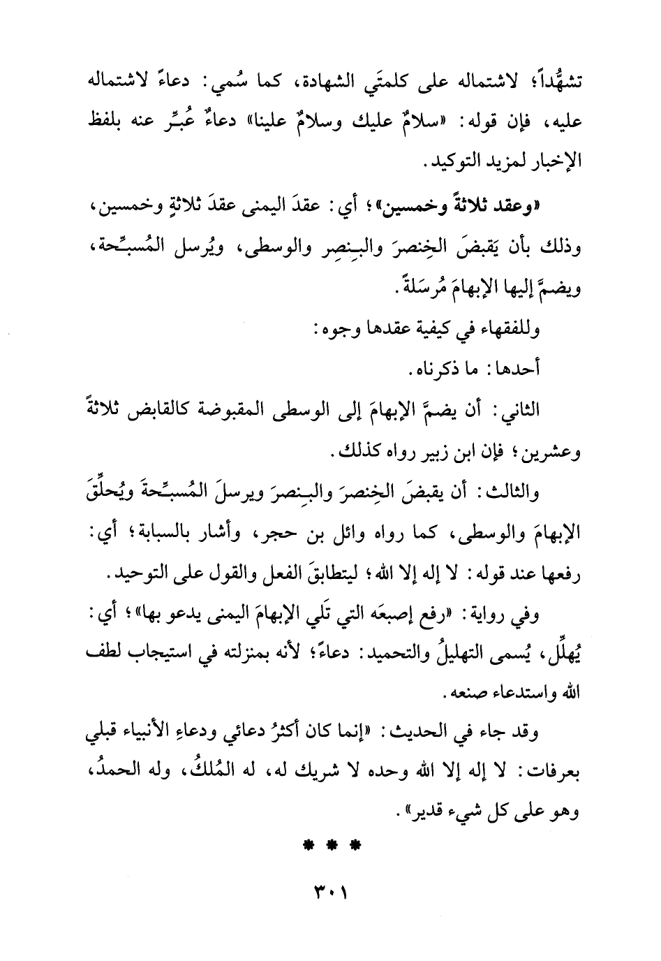 " وعقد ثلاثة وخمسين " أي: عقد اليمنى عقد ثلاثة وخمسين , وذلك بأن يقبض الخنصر والبنصر والوسطى , ويرسل المسبحة , ويضم إليها الإبهام مرسلة.