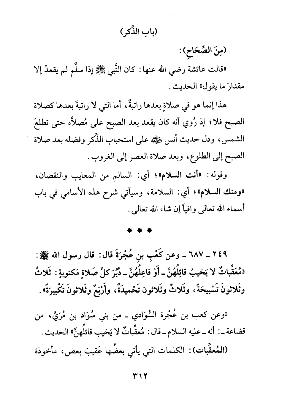 249 - 687 - وعن كعب بن عجرة قال: قال رسول الله صلى الله عليه وسلم: " معقبات لا يخيب قائلهن - أو فاعلهن - دبر كل صلاة مكتوبة: ثلاث وثلاثون لا تسبيحة , وثلاث وثلاثون تحميدة , وأربع وثلاثون تكبيرة ".